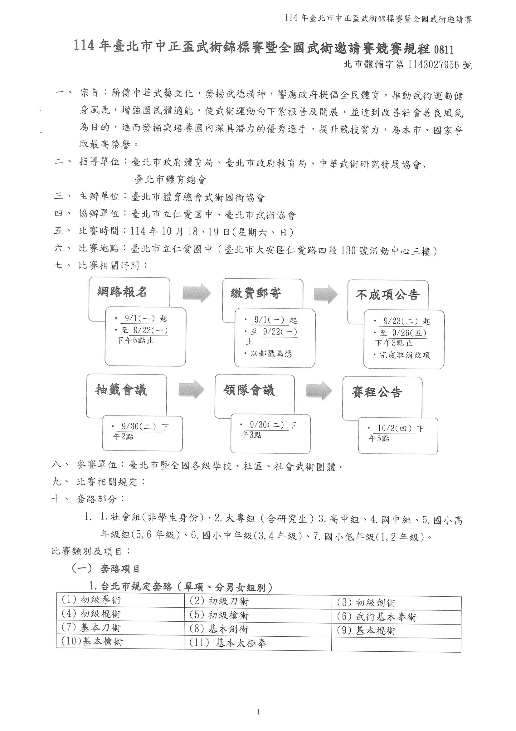 轉知114年臺北市中正盃武術錦標賽暨全國武術邀請賽競賽規程