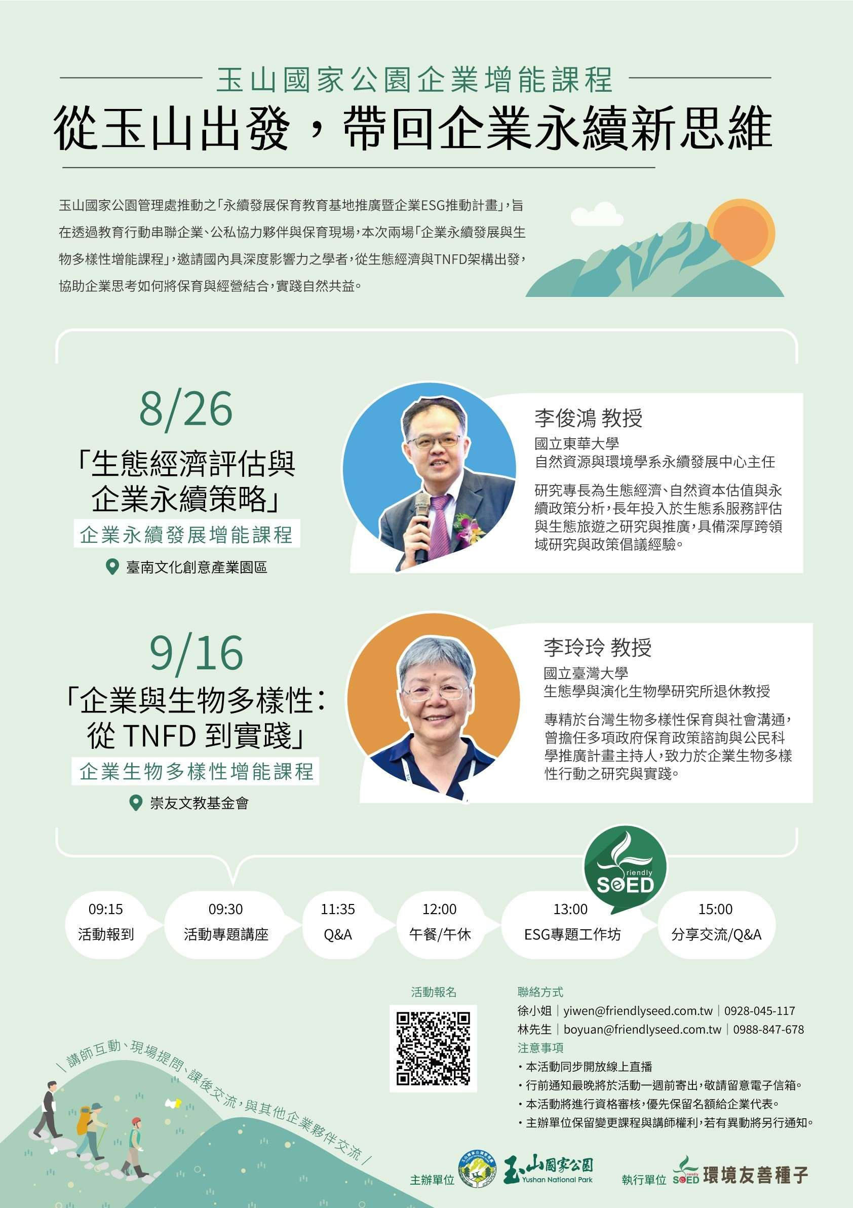 二、旨揭活動係玉山國家公園管理處為因應全球永續發展 (SDGs)目標,爰以「永續保育教育聯盟」共同推動各項 保育工作,並結合企業責任及ESG目標,盼引起各界共同參 與。