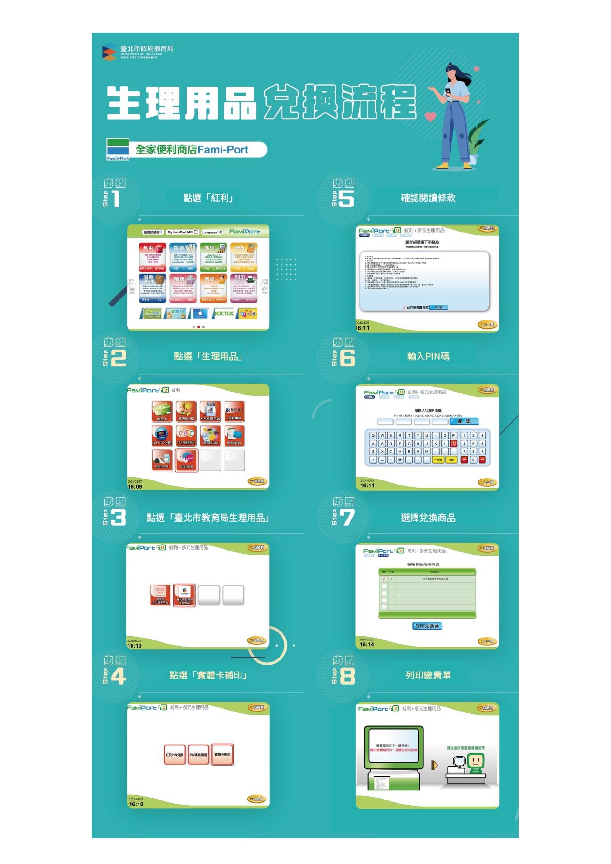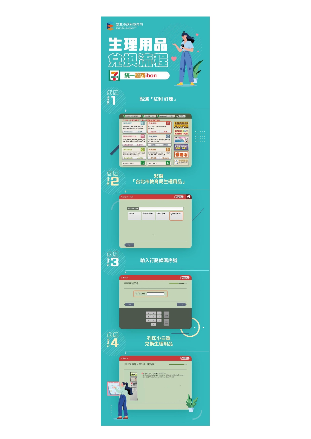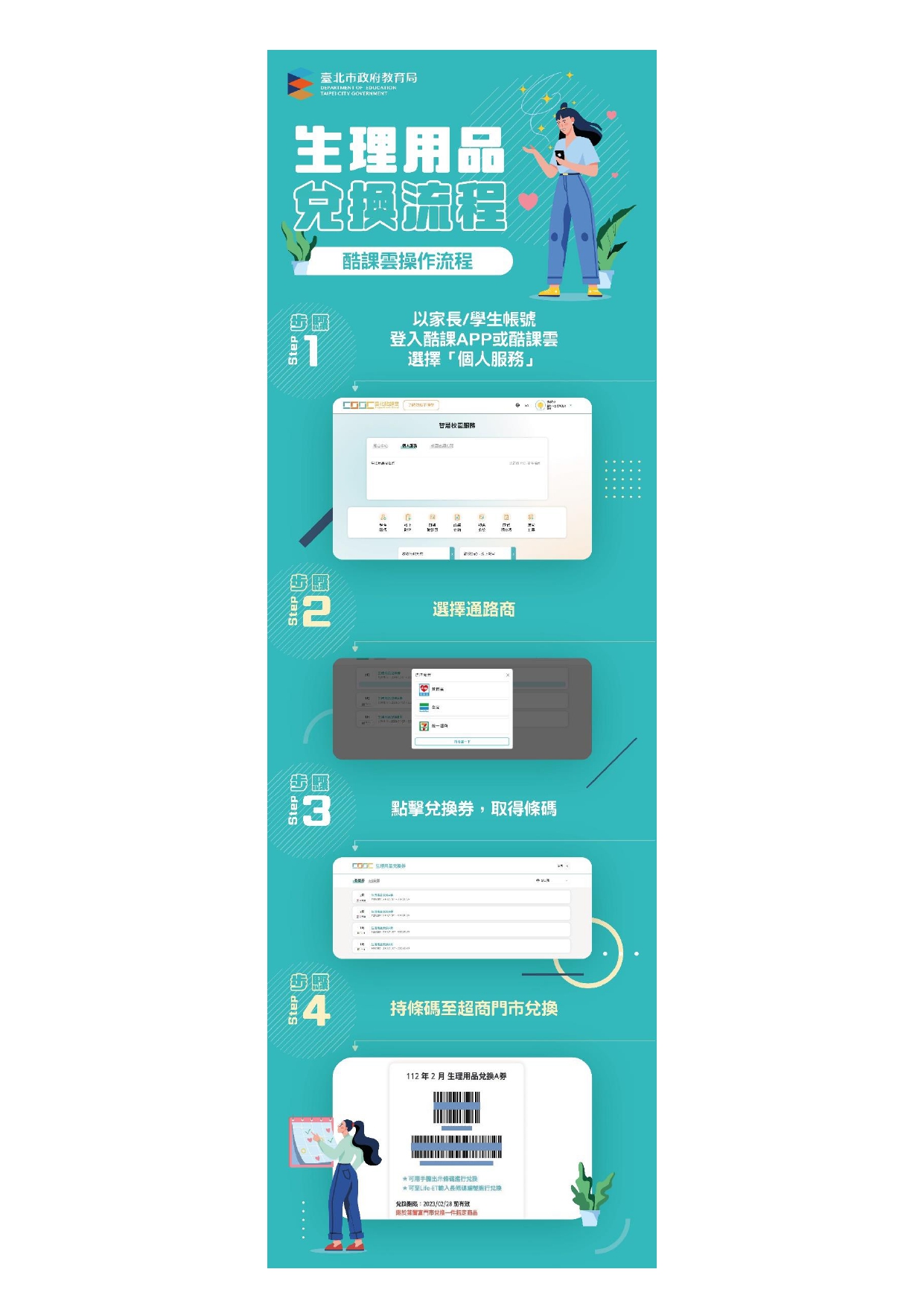 【女性生理用品補助計畫】本市推動「高國中小女性生理用品補助計畫」,請同學與家長把握每月兌換時間善加運用,計畫內涵與兌換方式請參閱說明。