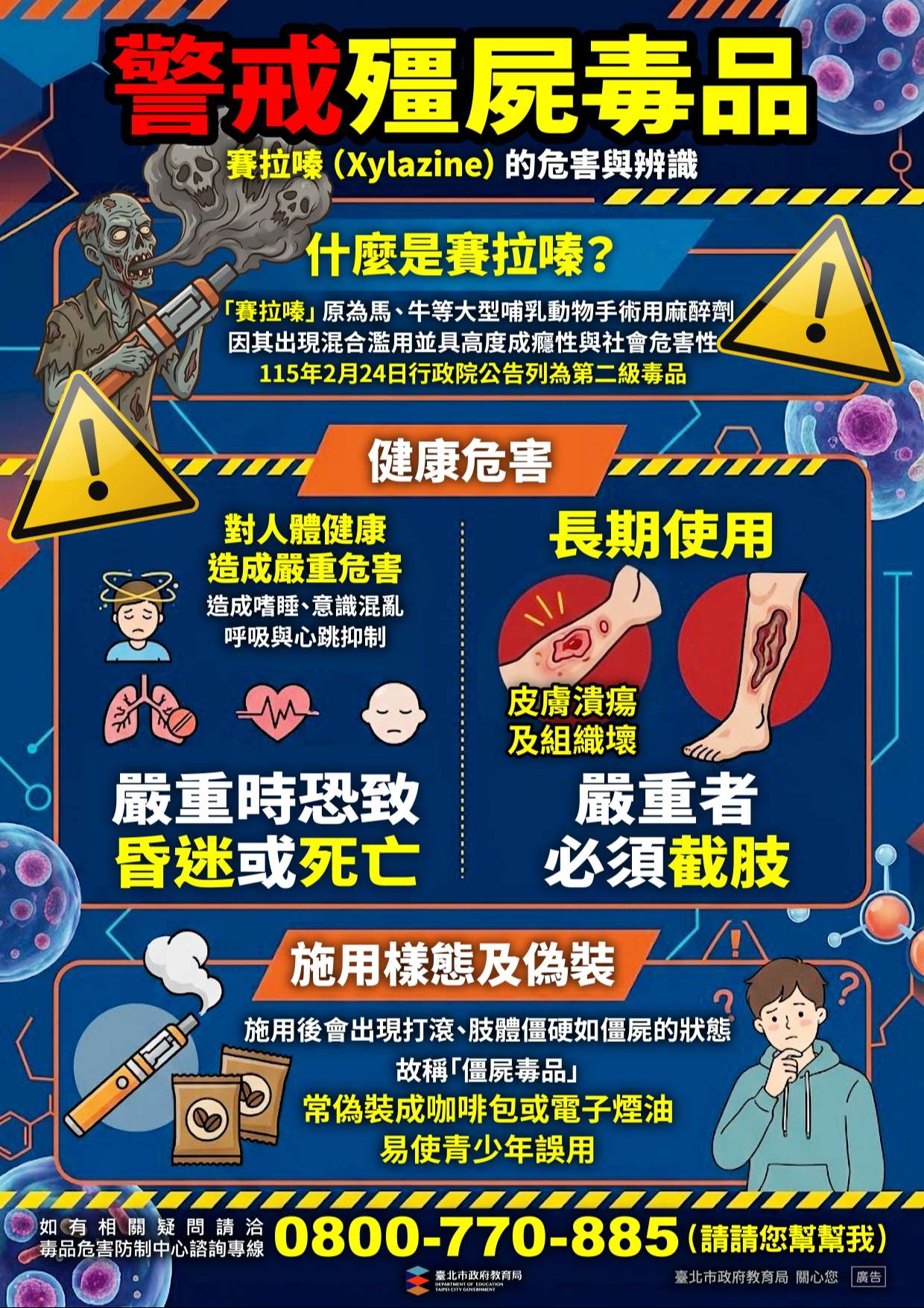 「賽拉嗪(Xylazine)」原為獸醫使用之麻醉藥物,近年遭濫用並常與其他毒品混合使用,施用後會出現打滾、肢體僵硬如僵屍的狀態, 故稱「僵屍毒品」