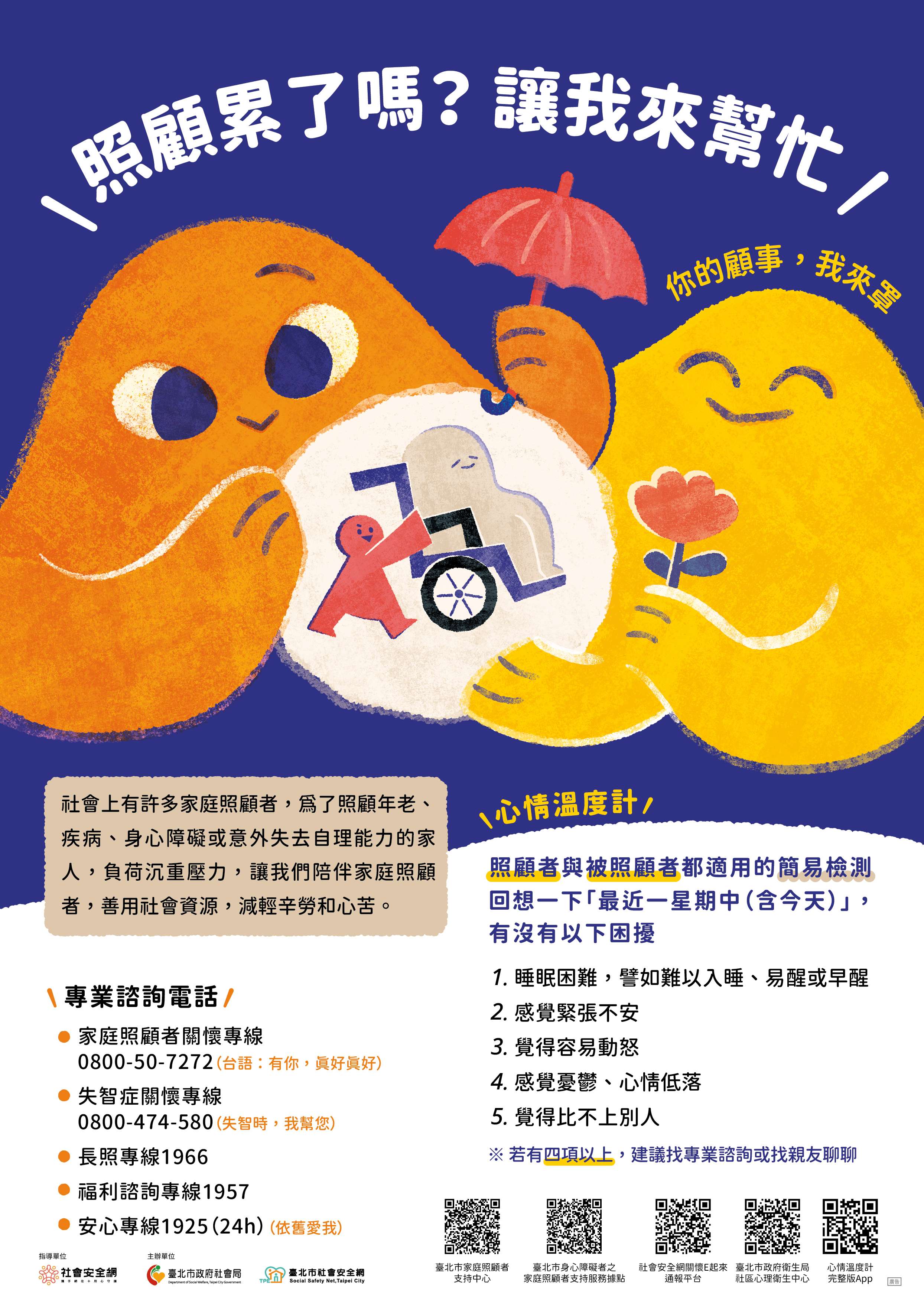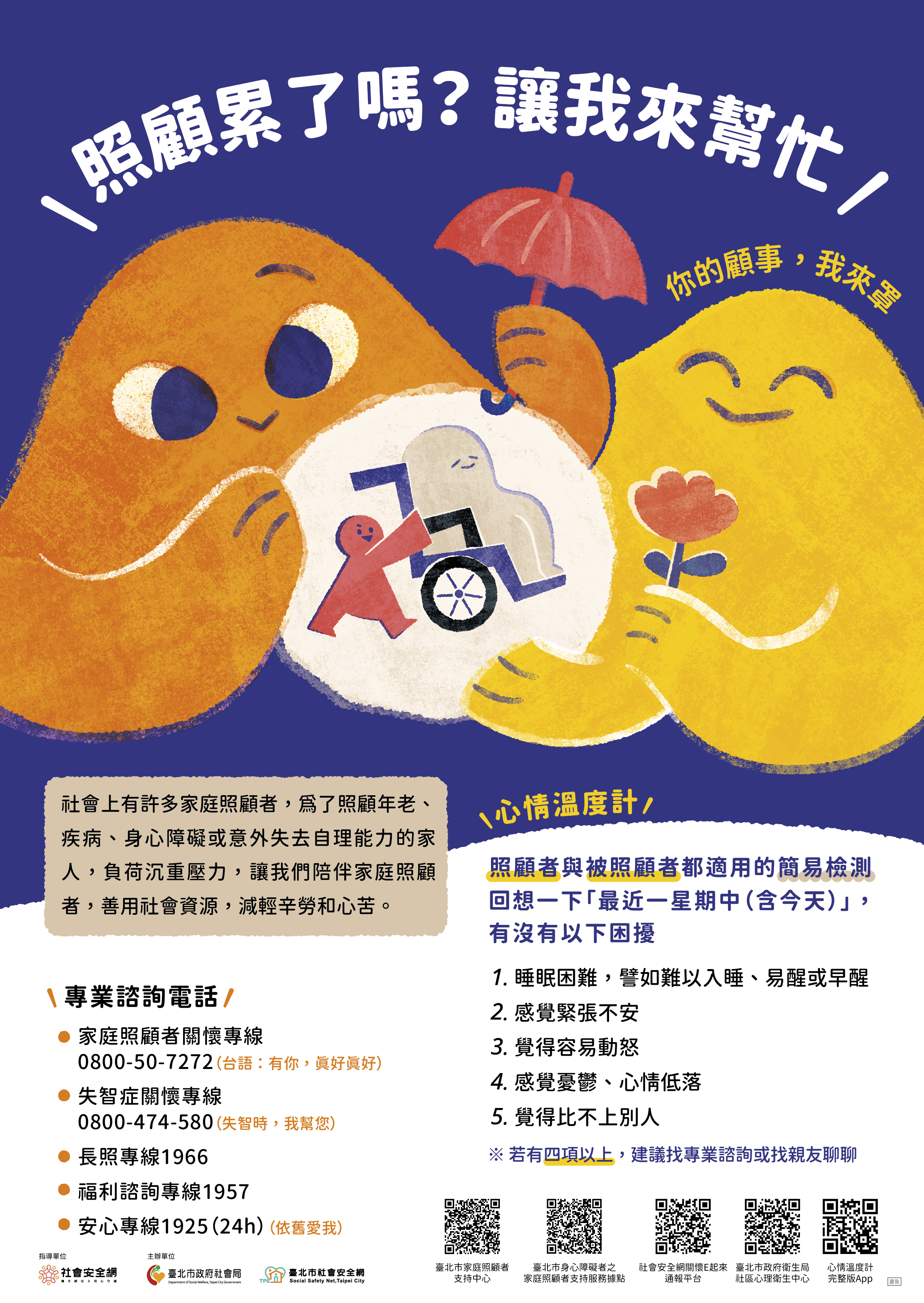 為關注「家庭照顧者」心理健康及需求,推廣社區友善互助及長期照顧資源,強化本市超高齡社會支持韌性,爰製作旨揭宣導海報及摺頁文宣。