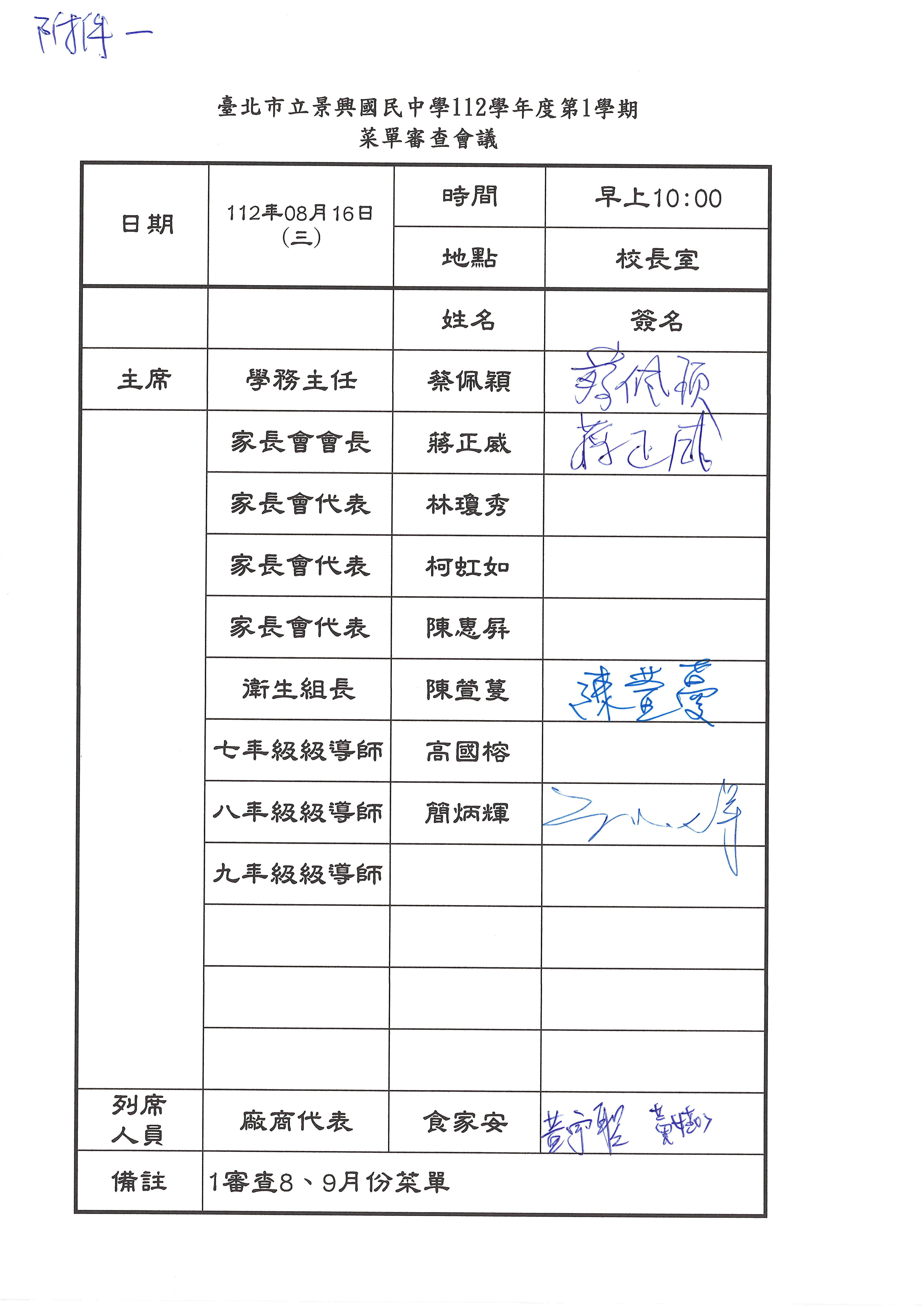 臺北市立景興國民中學112學年度第1學期8、9月份菜單審查會議紀錄