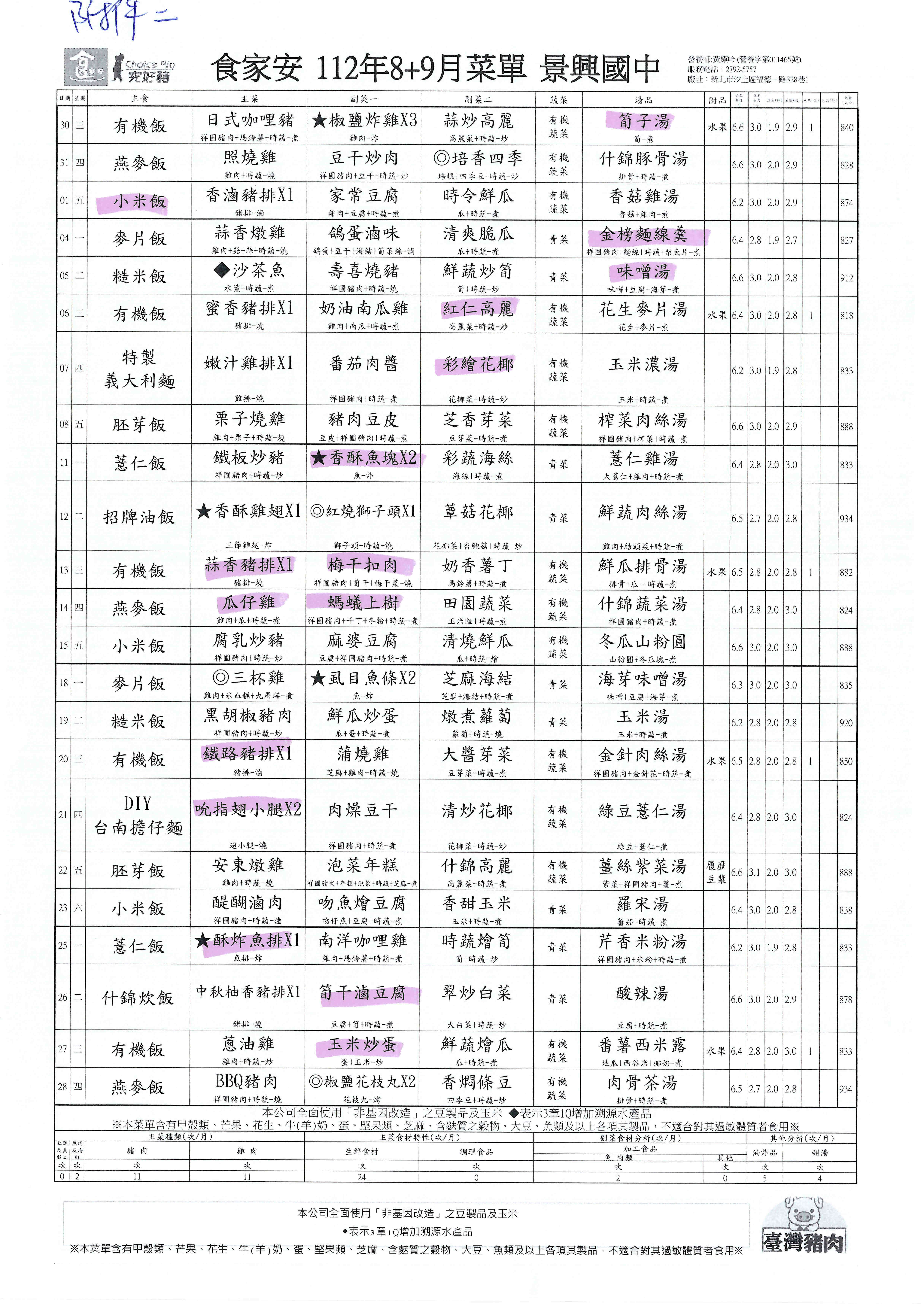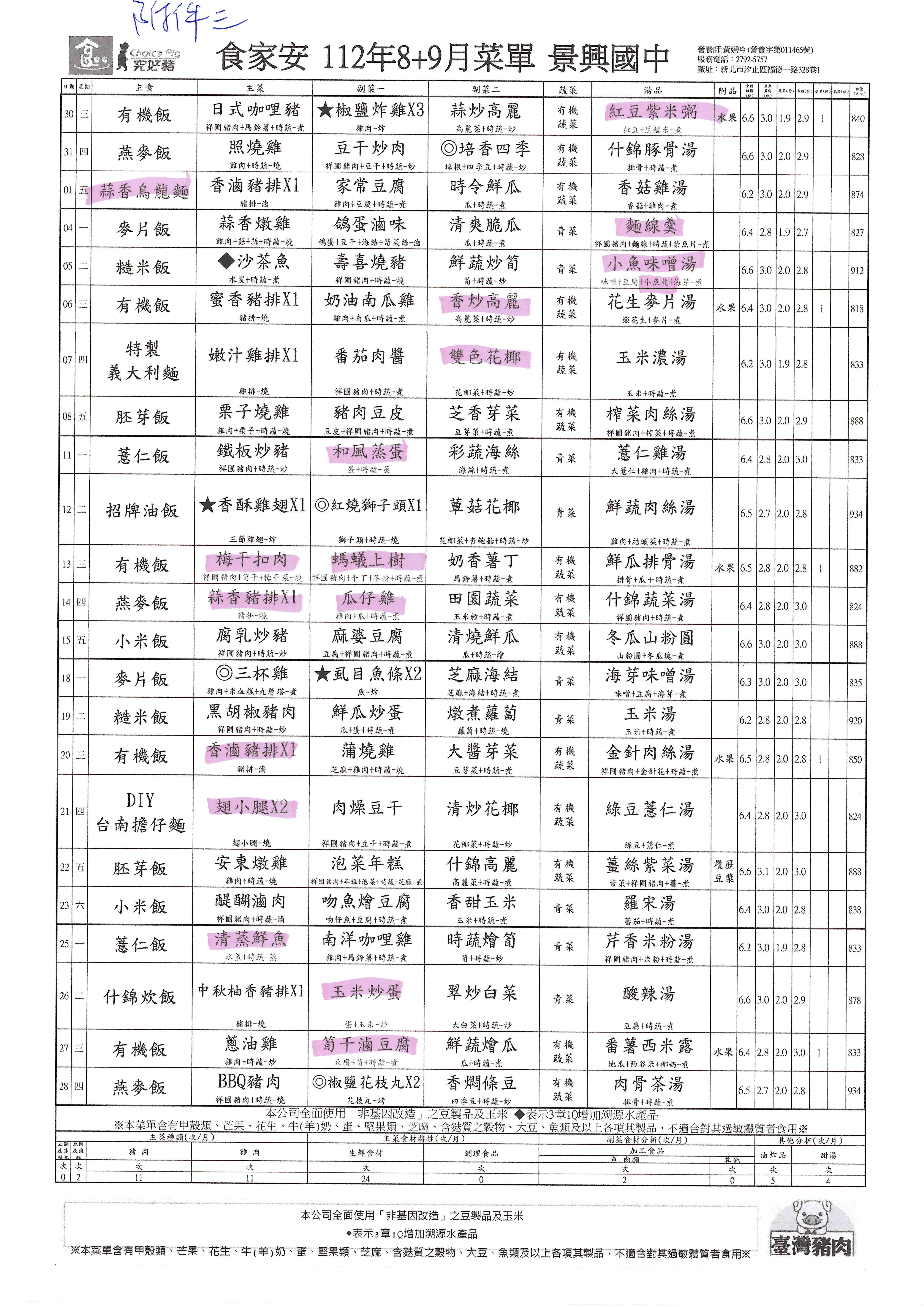 ◆討論本校112年8、9月份菜單(舊菜單-附件二),並做成下列決議:
