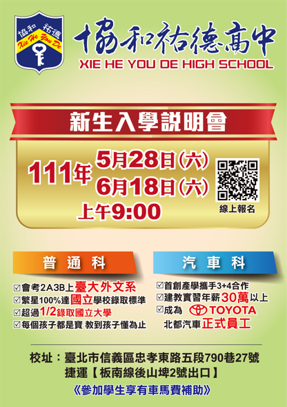 為了因應疫情海嘯來襲,配合防疫相關規範,協和祐德高中原定5月28日(六)上午9時至11時,舉辦新生入學說明會,將改以線上直播的方式進行。