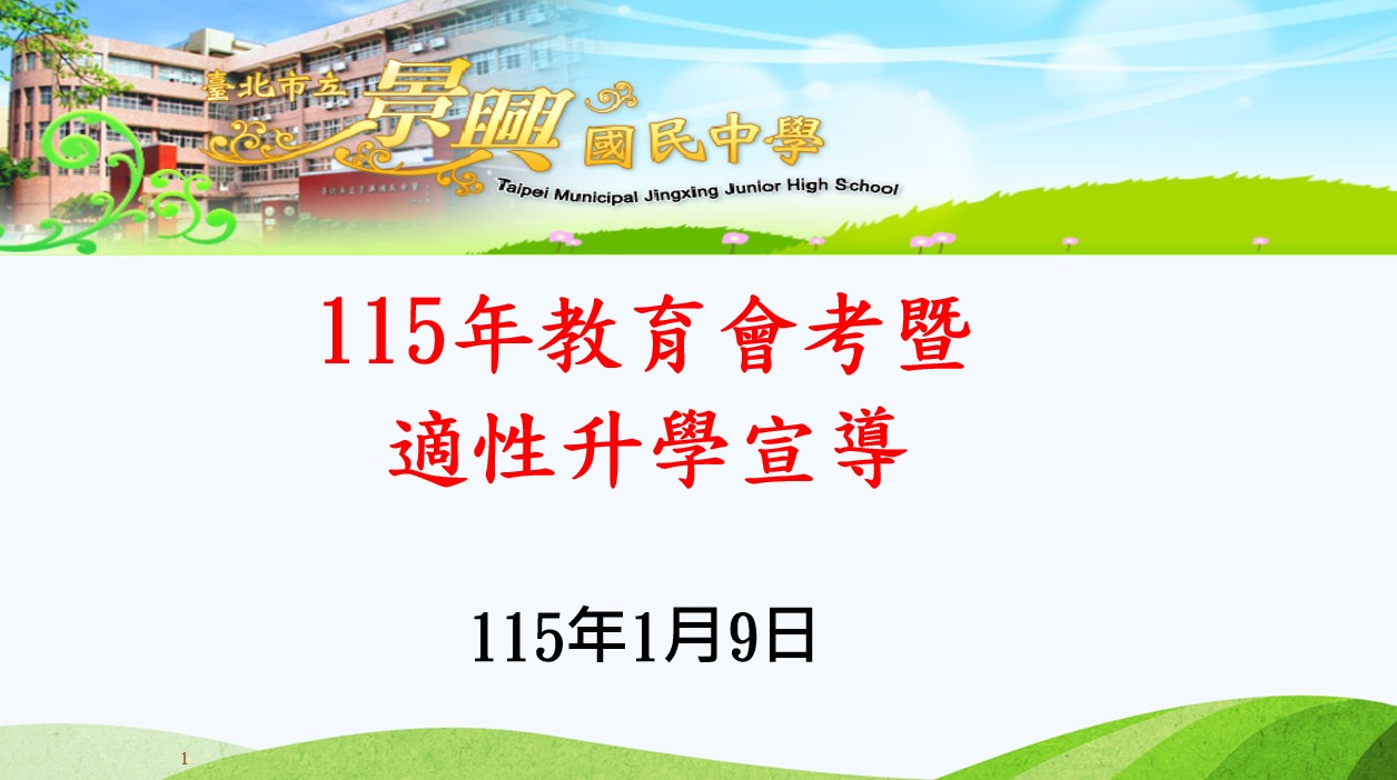 提供 114學年度 12年國教適性輔導與教育會考宣導 會議投影片(會議時間: 115/01/09 晚上19:00 -21:00)提供家長掌握了解九年級升學相關資訊