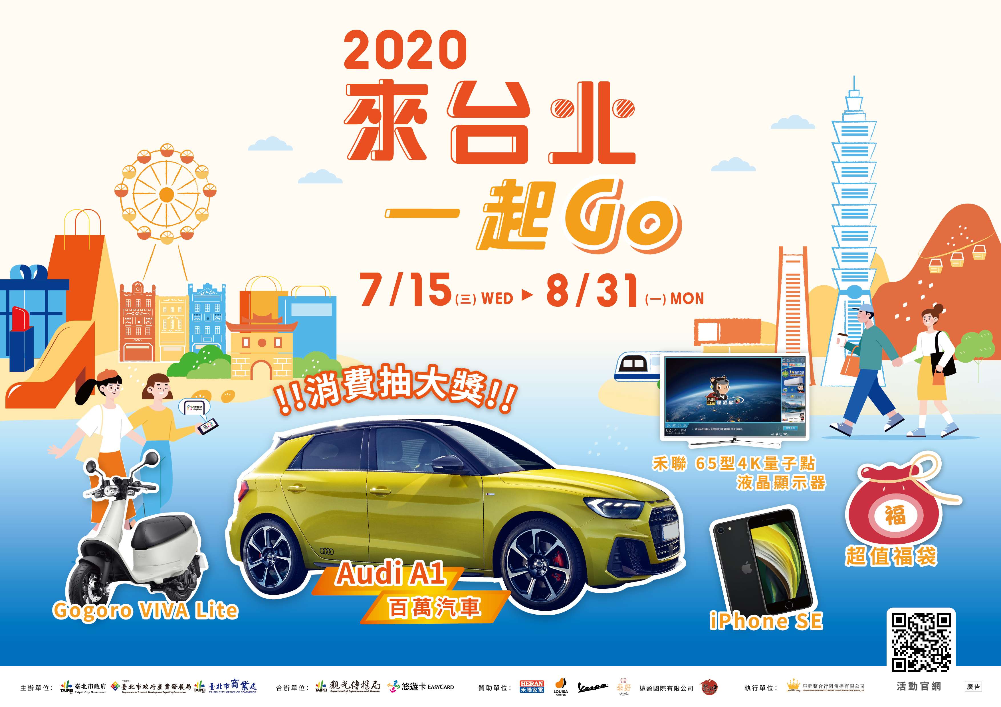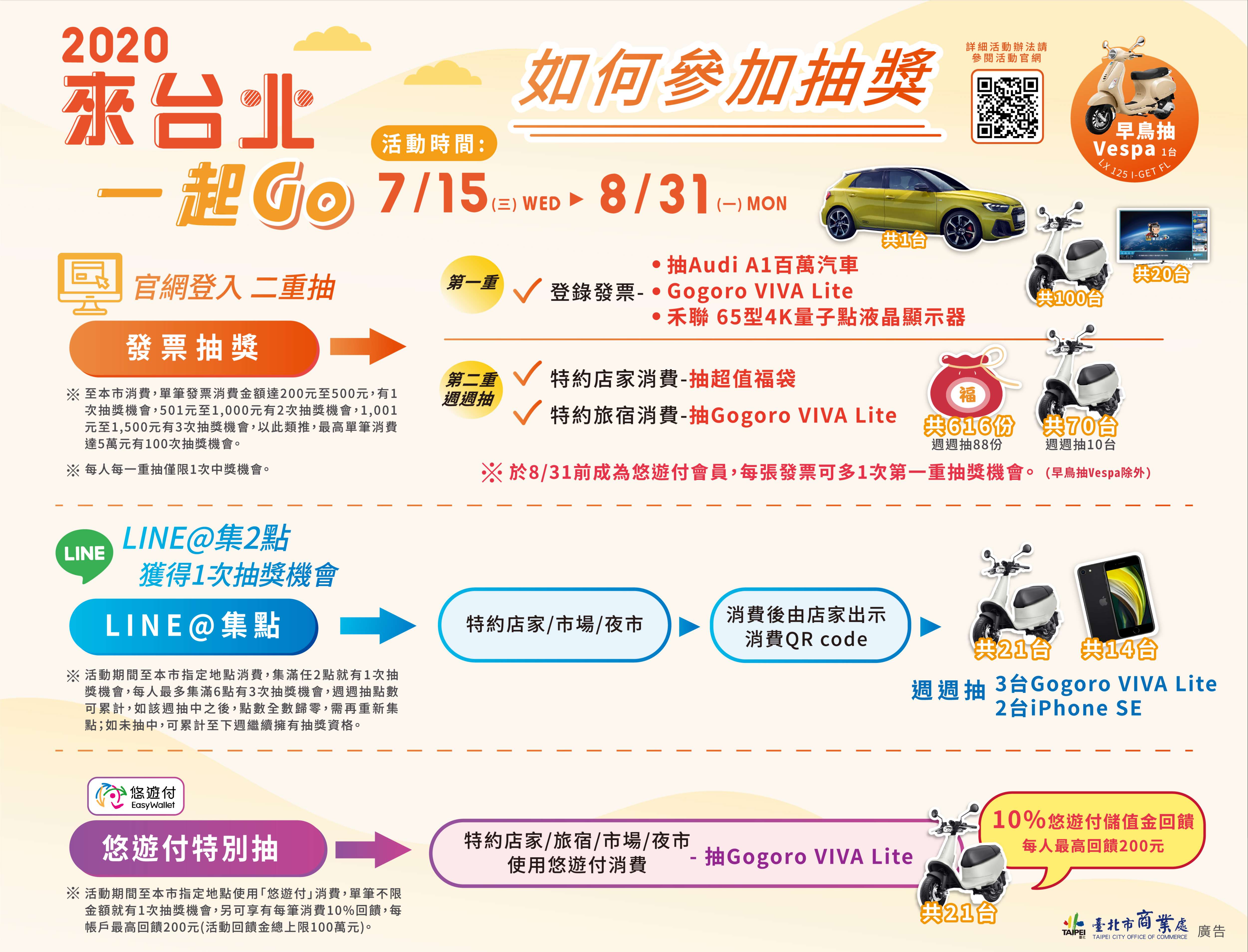 一、為提振本市商機,吸引民眾至本市消費,臺北市政府自109年7月15日至109年8月31日辦理「2020來台北一起GO」消費抽獎活動。