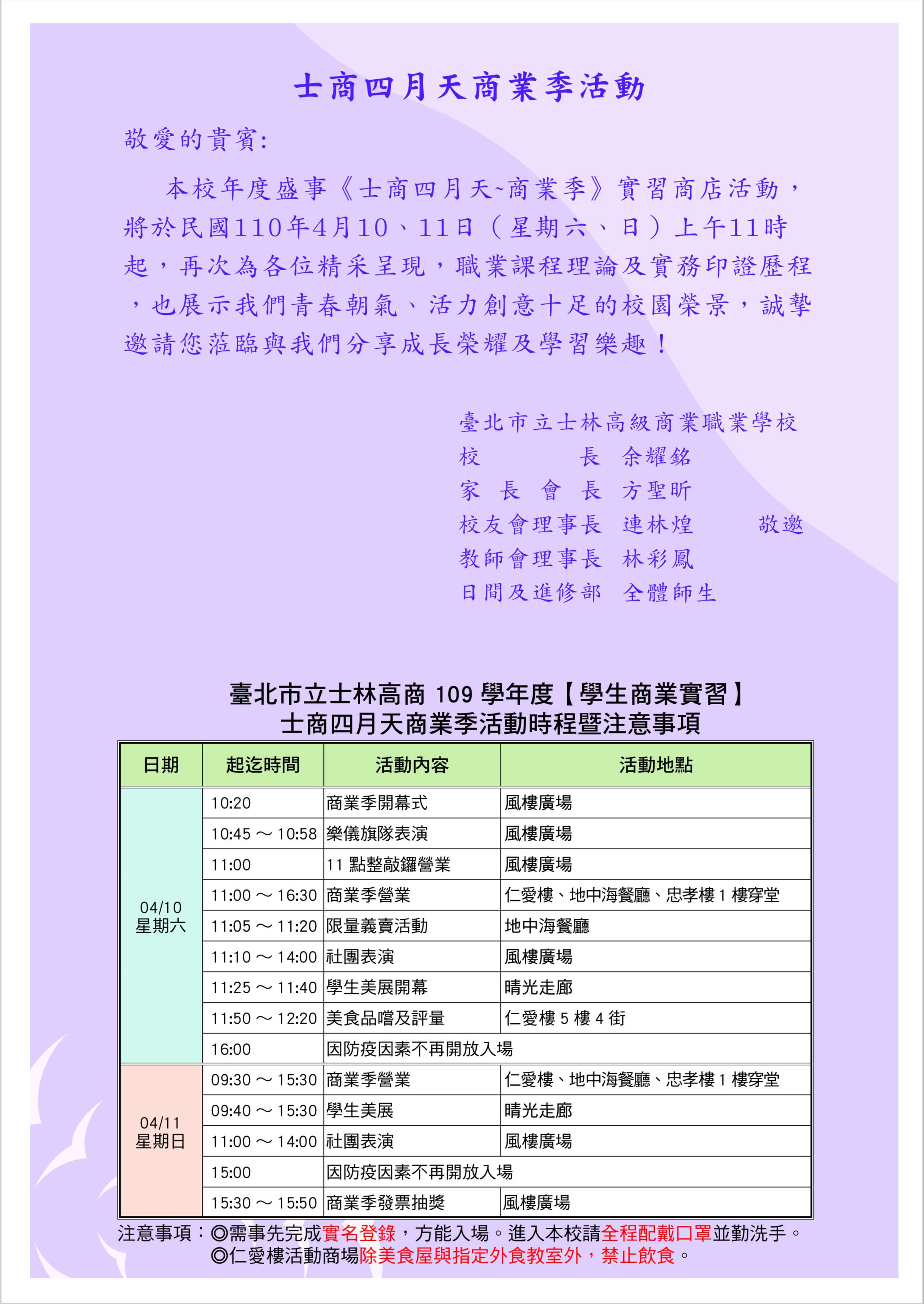 二、活動邀請函與海報如附件。其他未盡之事宜,請洽士林高商實習處實習組羅翊瑄組長,電話:(02)2831-3114轉分機502。