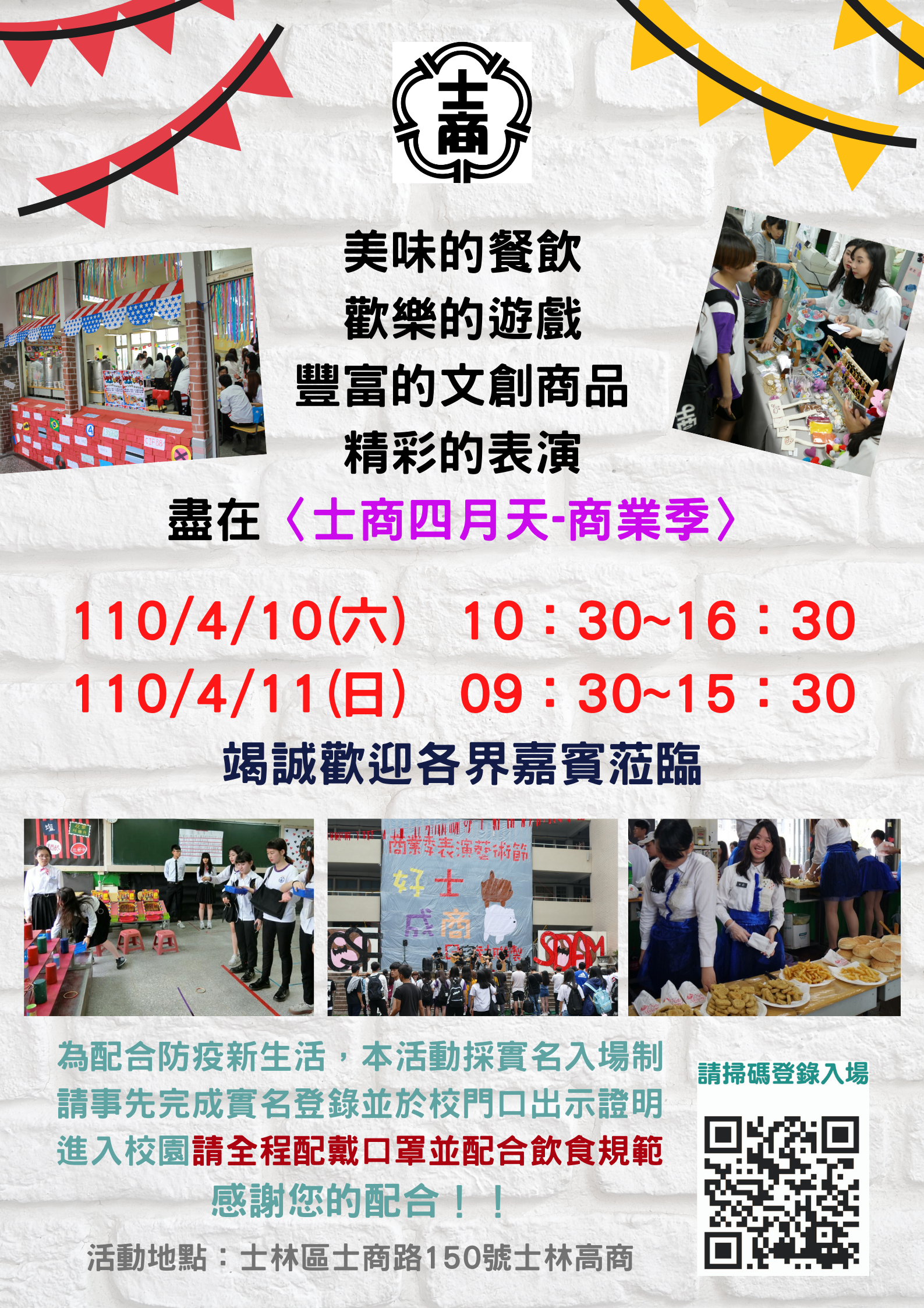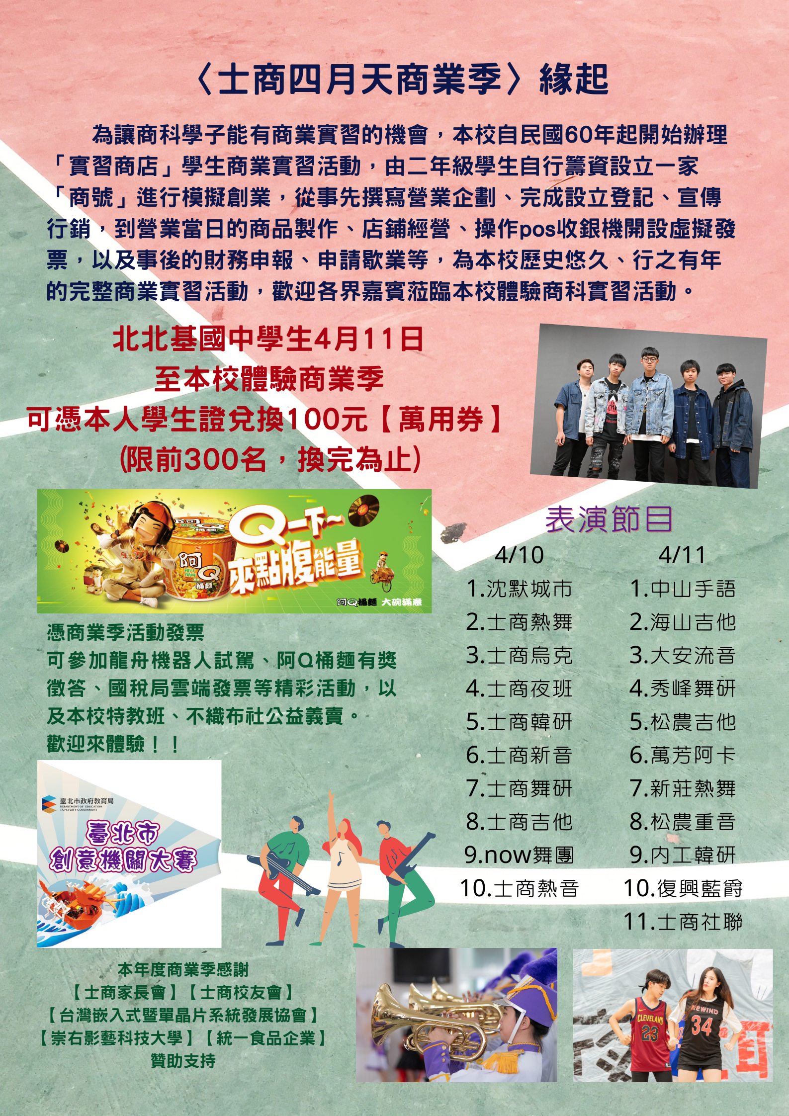 一、士商竭誠歡迎對技術型高中商業類科有興趣的國中生入校體驗,4月11日(星期日)憑本人國中學生證入場可獲得100元體驗券(限前300名,一人兌換一張)。