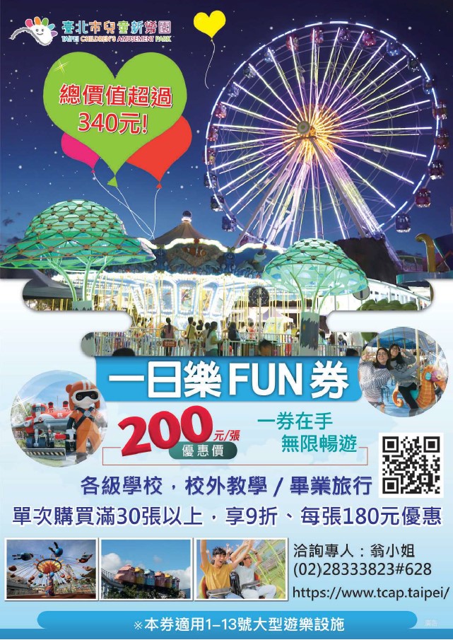 三、目前兒童新樂園針對全國中、小學,提供遊樂設施運作基 礎原理解說服務(每日限量、需事先預約),並搭配推出 「一日樂FUN券」校外教學優惠,內含入園門票及可於當日 不限次數搭乘本園區編號1 號至13號大型遊樂設施, 學校單次購買「一日樂Fun劵」數量達30張,即可享9折、 每張180元優惠價(原價200元),以利校方規劃校外教學及 畢業旅行等活動參考利用。