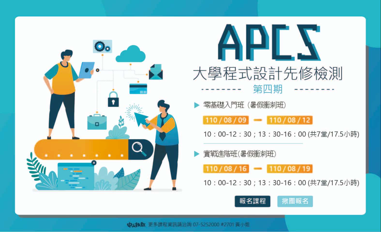 一、APCS「大學程式設計先修檢測」(Advanced Placement Computer Science,APCS)主要為檢測考生程式設計的能力,讓具備程式設計能力之高中職學生,有個具公信力的檢測學習成果,並提供做為大學優秀選才的參考依據。