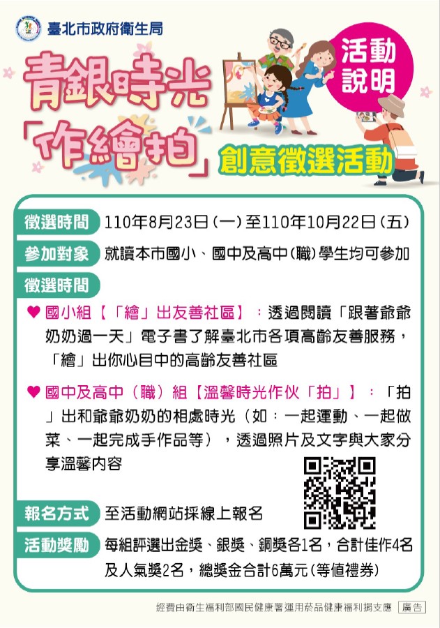 (三)徵選組別與主題:「國小組-『繪」出友善社區」、「國 中及高中(職)組-溫馨時光作伙『拍』」。
