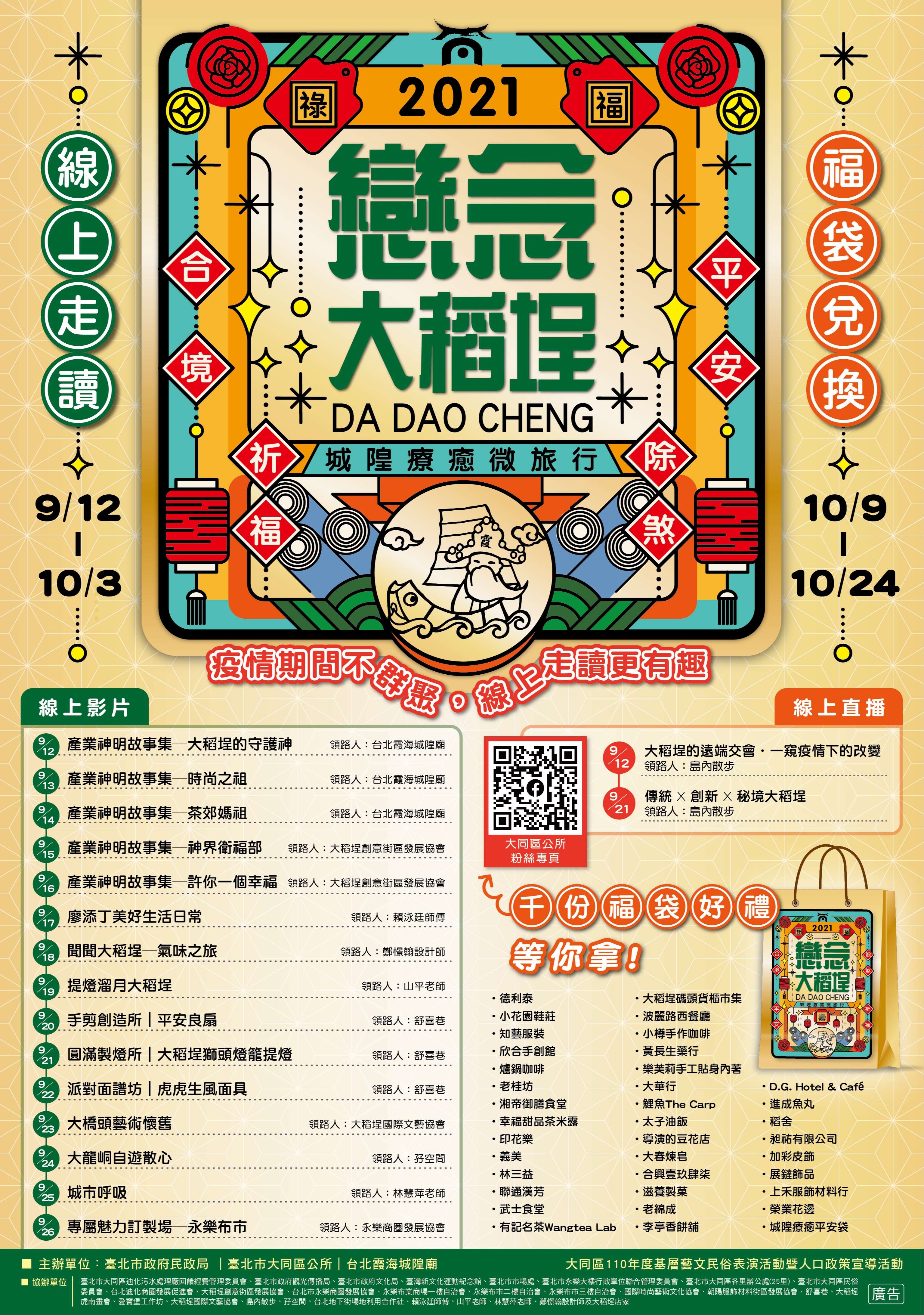 (二)內容:「2021戀念大稻埕─城隍療癒微旅行」線上活 動,將於9月12日(日)至10月24日(日),在"臺北市 大同區公所"臉書粉絲專頁溫暖登場,推出17條線上走 讀路線,以及千份超值店家福袋好禮等您來抽獎。歡迎 市民朋友相揪上線來參加,活動詳情請關注「當我們同在一起(臺北市大同區公所)」臉書粉專(https://www. facebook.com/DatongDO/)或電洽(02)25975323分機802 陳先生。