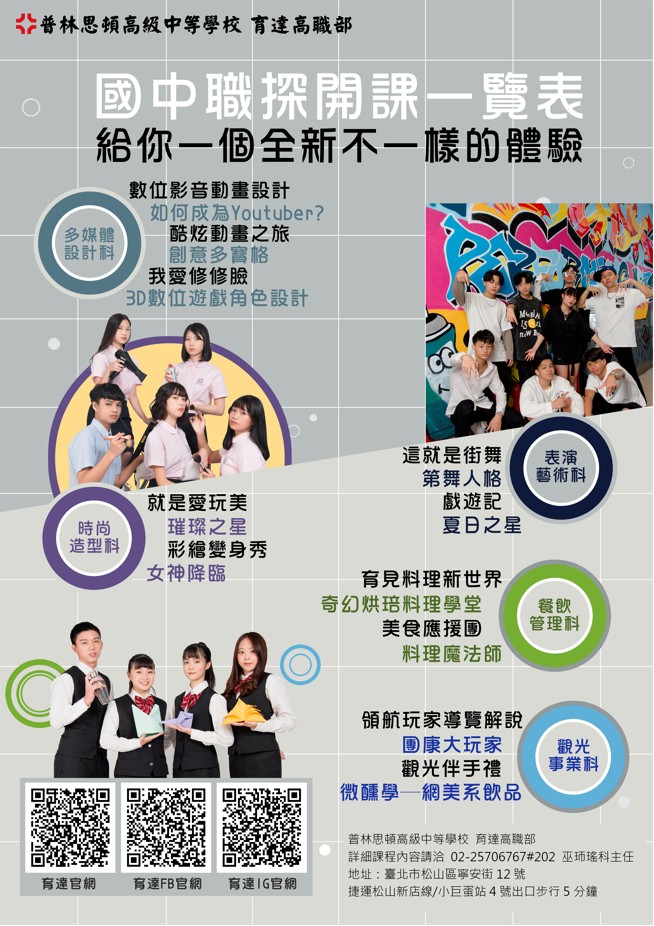 一、普林思頓高中(原育達高職)共有四大群科(設計、藝術、家政及餐旅群),五大專業類科(多媒、表藝、時造、觀光及餐飲科)。