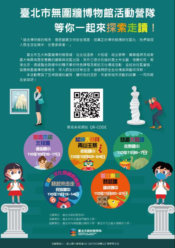 三、錄取方式及通知:每名學生限報1場次,如人數超過上限, 報名後將進行電腦亂數抽籤,最終錄取名單以主辦單位公 告為準。錄取名單最遲於110年10月6日(星期三)16:00前, 公告於無圍牆博物館報名系統網站。