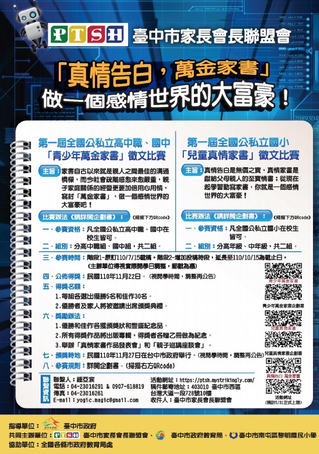 三、旨揭比賽最新資訊請至https://ptsh.mystrikingly.com/ 查詢;如有疑義,請逕洽臺中市家長會長聯盟會鍾先生, 電話:(04)2301-6291或0907-618-819、電子信箱: yogic. magic@gmail.com。