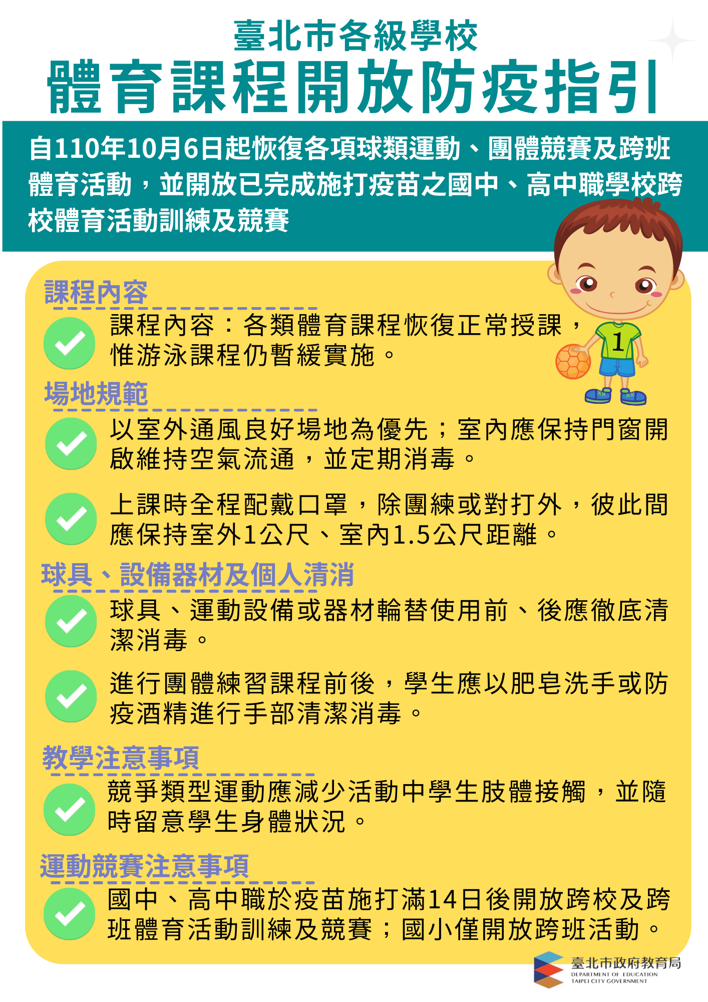 因應嚴重特殊染性肺炎(COVID-19,簡稱新冠肺炎)疫情趨緩,本市公私立各級學校自110年10月6日起開放體育課程及體育活動指引如下: