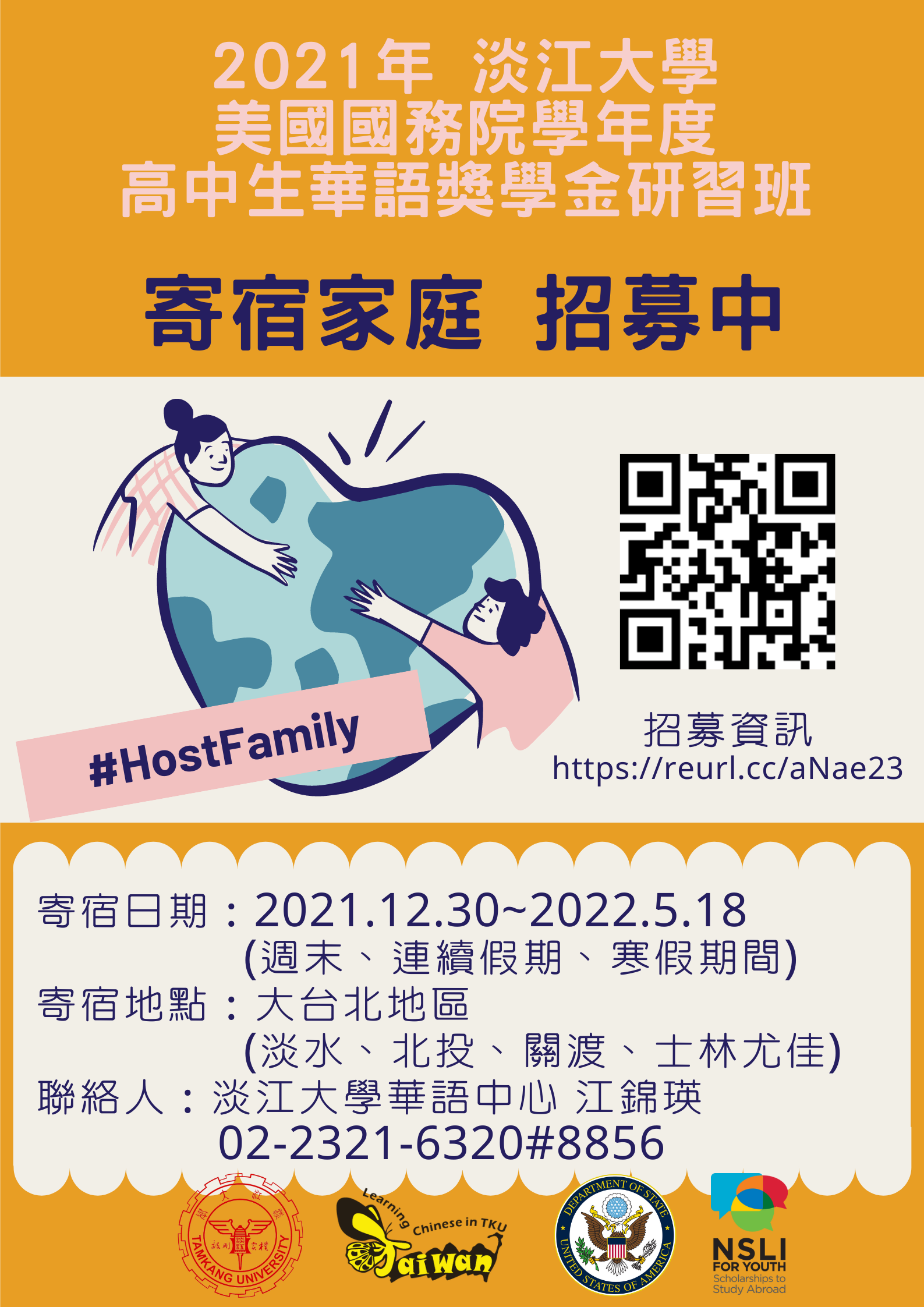 二、為促進美國高中生於在臺學習期間與當地臺灣人進行文化 交流、培養日常生活中運用華語能力,故特別尋找對認識 美國文化、並願意敞開家門的臺灣家庭,以提供高中生非 上課期間的寄宿接待,藉此旨揭家庭與外國學生認識不同 風俗習慣與文化的機會。