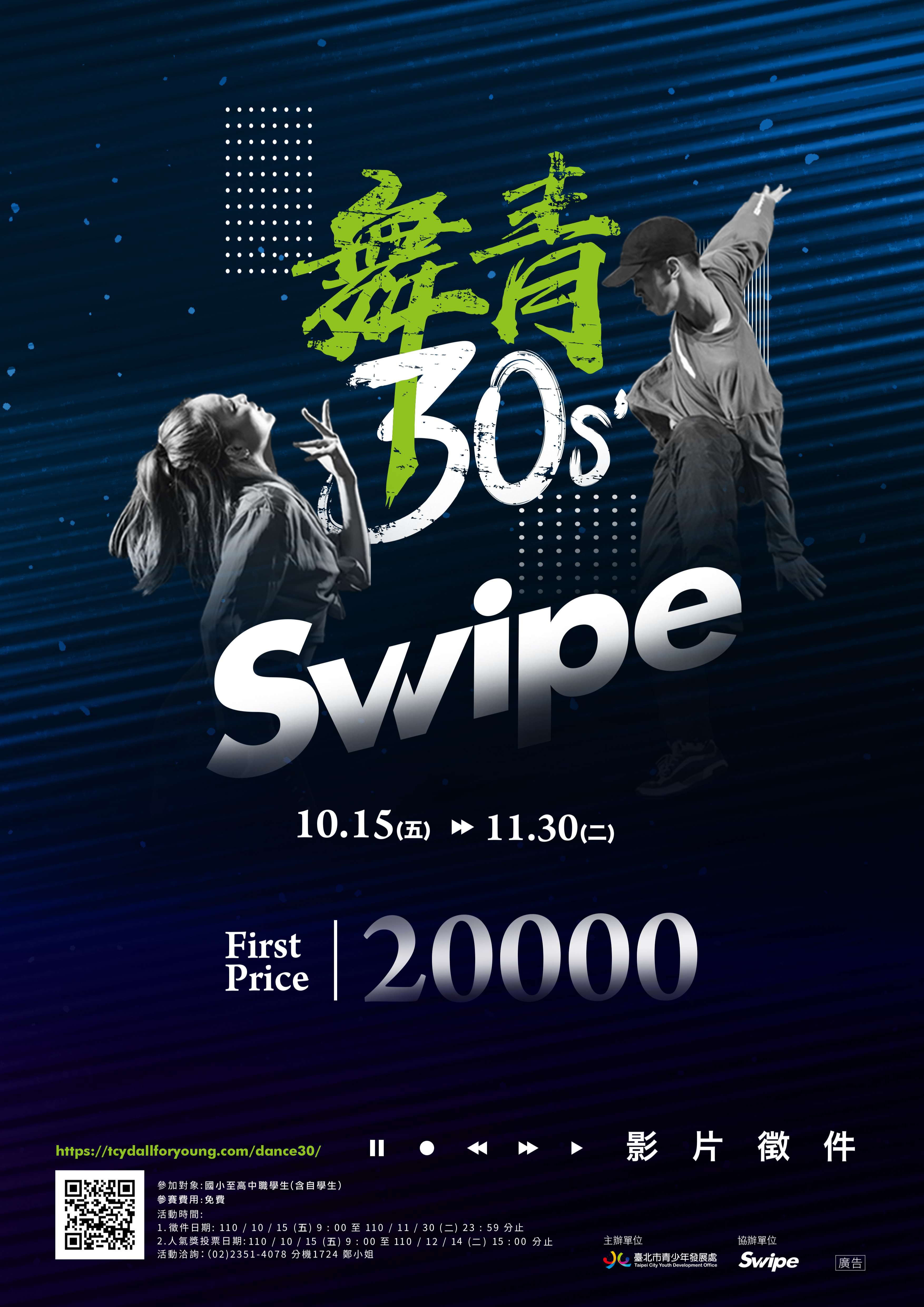 二、比賽內容如下: (一)參加對象:國小至高中職學生(含自學生)。 (二)活動時程: 1、報名日期:即日起至110年11月30日(星期二)23時59分 止。 2、人氣獎投票:即日起至110年12月14日(星期二) 15時 止。 (三)報名費用與方式:免費,一律採網路報名 https://tcydallforyoung.com/dance30/ 。 (四)參賽規則: 1、影片長度:30秒(±5秒)。 2、舞(曲)風、服裝:不限。 3、比賽主題:疫起瘋街舞。 (五)參賽組別: 1、高中職組:限高中職在學生(含自學生)。 2、親子組:限國中/小在學生(含自學生)。 (六)各組獎項及額度: 1、第1名:新臺幣2萬元禮券、獎狀每人1只。 2、第2名:新臺幣1萬元禮券、獎狀每人1只。 3、第3名:新臺幣8,000元禮券、獎狀每人1只。 4、人氣獎:新臺幣5,000元禮券、獎狀每人1只。