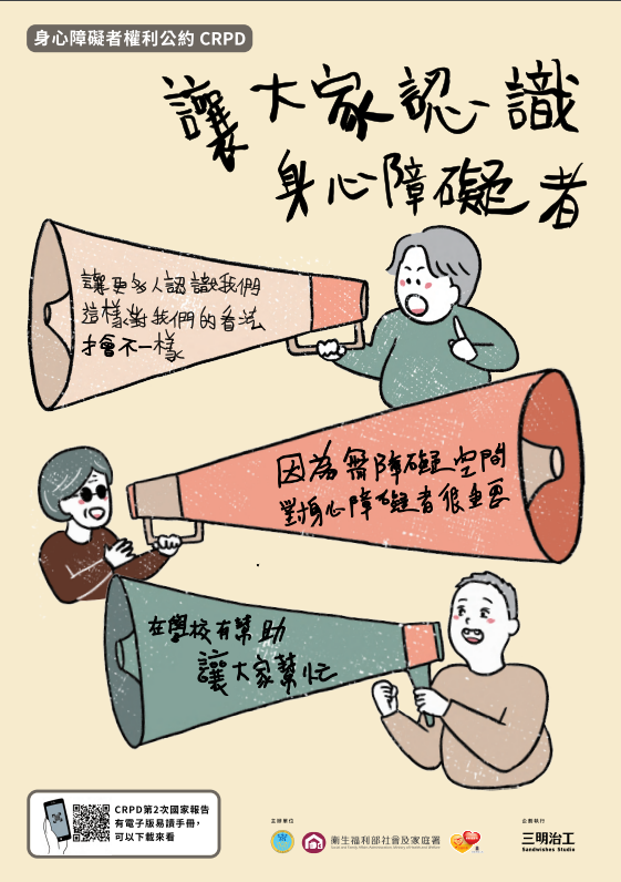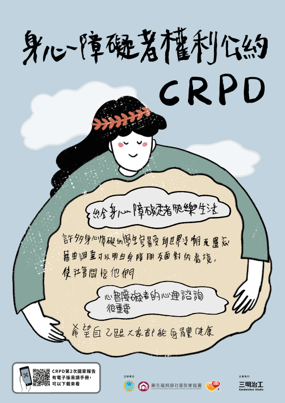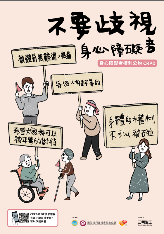 「身心障礙者權利公約(CRPD)第二次國家報告易讀版」手冊共4冊並製作有聲書,電子檔附掛於 CRPD 資訊網「宣導專區」(網址:https://crpd.sfaa. gov.tw),請逕自下載運用。