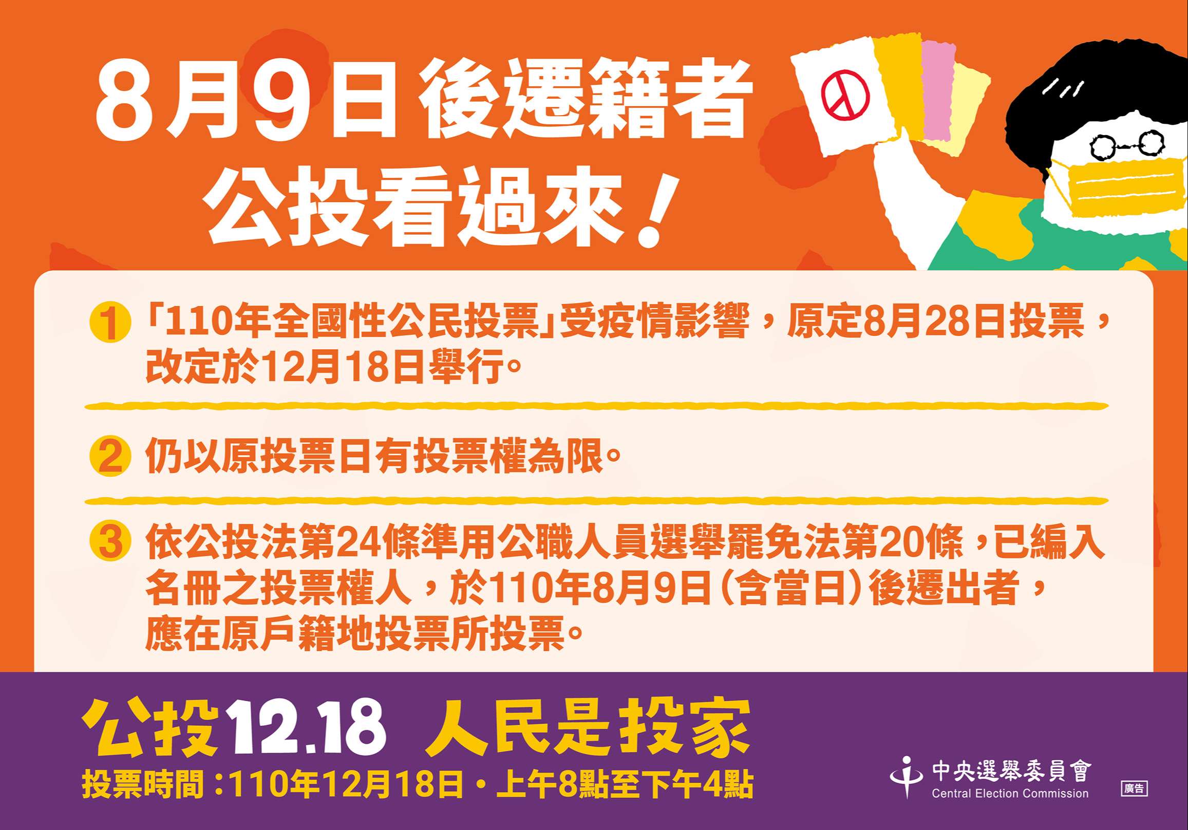 二、110年全國性公民投票原定投票日期為110年8月28日,因受嚴重特殊傳染性肺炎疫情影響,改定於110年12月18日舉行投票,故投票權人仍以原投票日110年8月28日有投票權資格之投票權人為限。又依公民投票法第24條準用公職人員選舉罷免法第20條規定,已編入投票權人名冊之投票權人於110年8月9日(含當日)以後遷出者,仍應在原戶籍地投票所投票。
