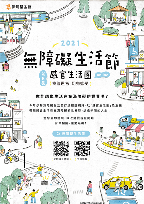 二、為營造友善生活圈及推廣尊重差異、多元共融的觀念,伊甸基金會連續八年舉辦「無障礙生活節」公益活動,透過展覽與互動體驗等形式,促進社會大眾了解無障礙生活的各種面向。伊甸第八屆無障礙生活節以「感官生活圈」為主題, 今年因應防疫特別打造線上體驗網站 (https://touchinglife-online.eden.org.tw/),帶大家體會生活在充滿障礙的世界時,處處卡關的人生。防疫期間,亦十分適合做為社會教育宣導與線上教學教材使用。邀請大家練習跳脫習以為常的生活模式,從聽覺、視覺障礙體驗,到輔具配對遊戲,感受面對不同障礙時的不便與挑戰,一起幫助身障朋友撕掉負面標籤,給他們溫暖鼓勵與支持力量。