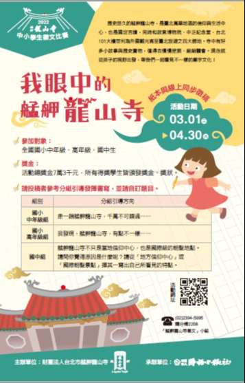 「2022艋舺龍山寺中小學生徵文比賽 我眼中的艋舺龍山 寺」活動網址https://bit.ly/320t70i