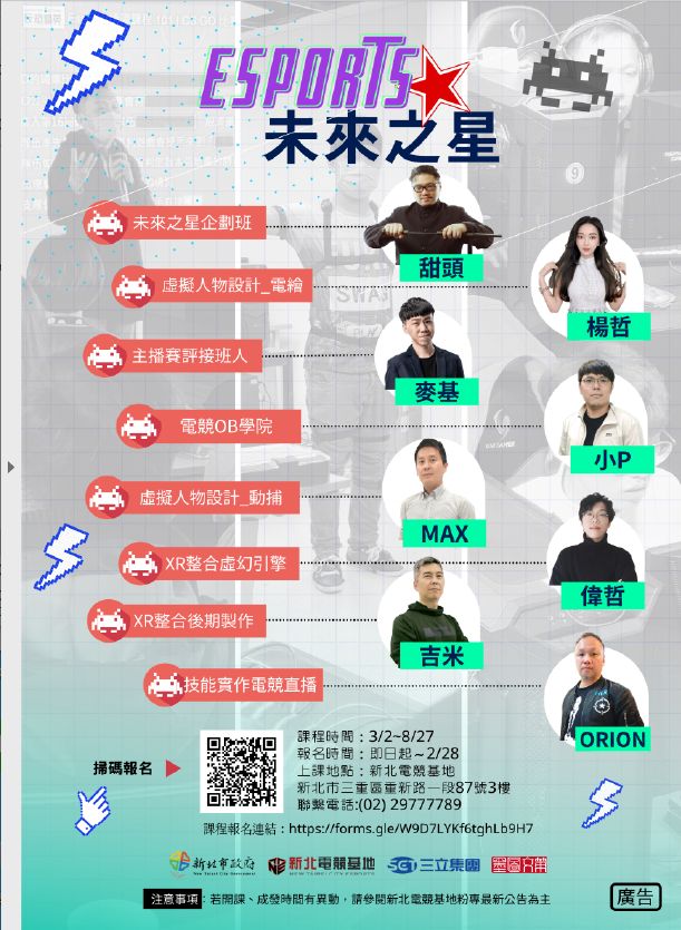 相關課程報名資訊公布於新北市政府經濟發展局網站(https://reurl.cc/rQKeVZ)及新北電競基地臉書粉絲團(https://www.facebook.com/ntpcesportsbase/)