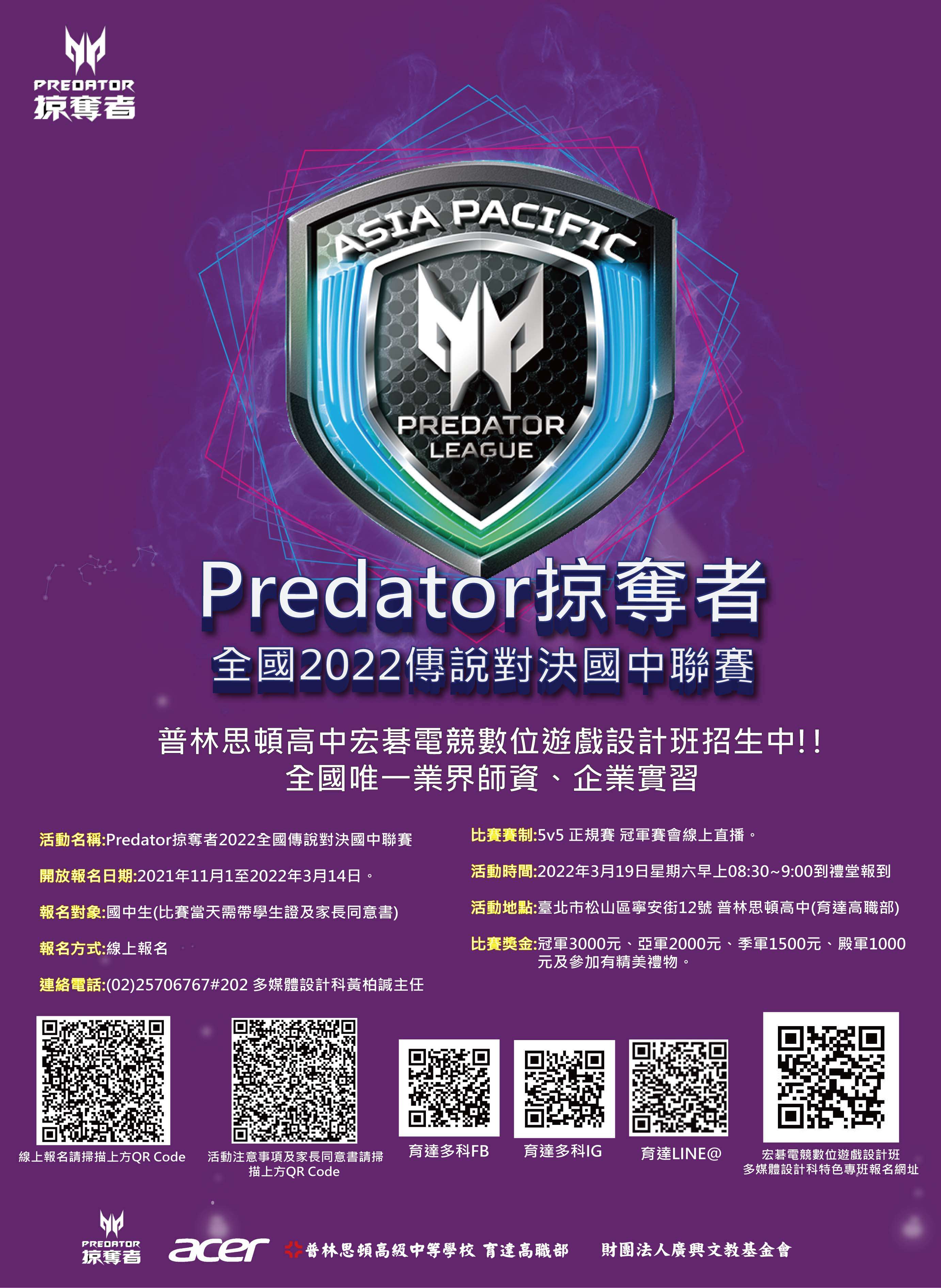 一、宏碁股份有限公司舉辦「Predator掠奪者全國2022傳說對 決國中聯賽」,原訂2022年1月22日(星期六)比賽,因疫情 延期至2022年3月19日(星期六)。