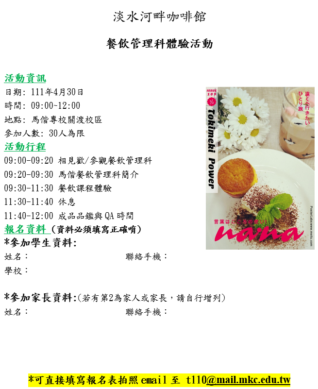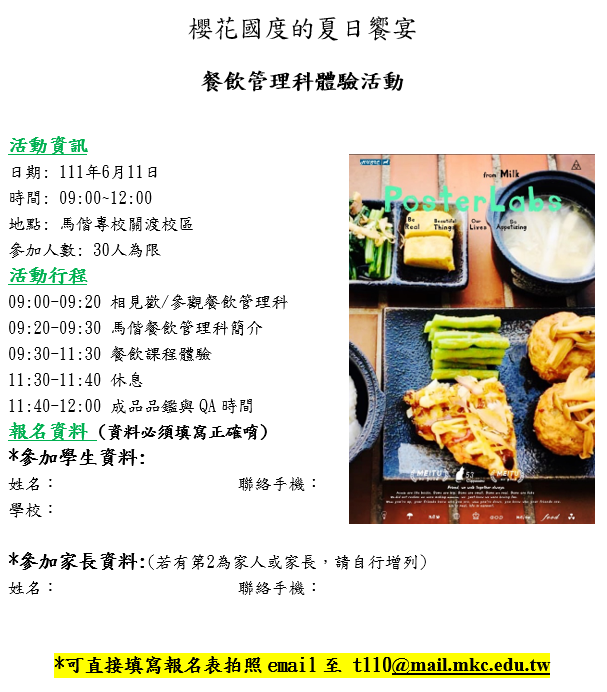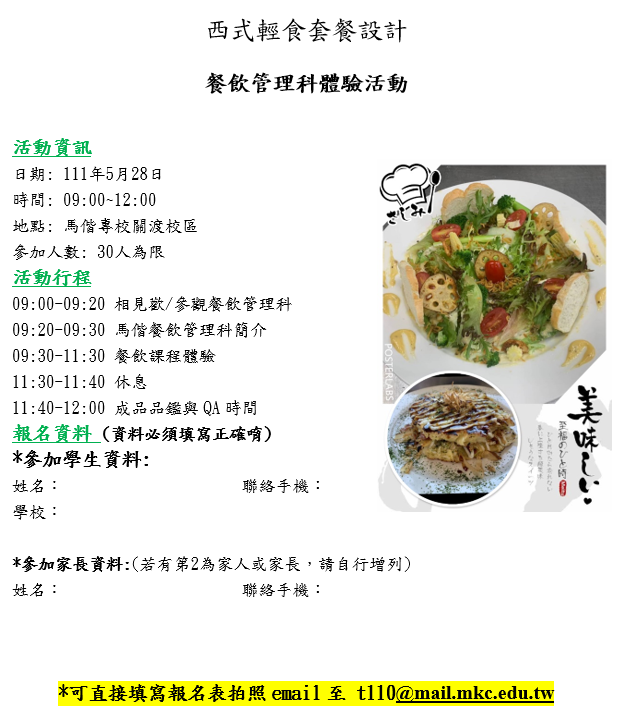 主旨:為增進國中學生及家長(親子)對餐飲管理科之瞭解,馬偕醫護管理專科學校特規劃體驗學習活動,透過實作課程協助學生試探自己的興趣及潛能,以作為生涯規劃參考。