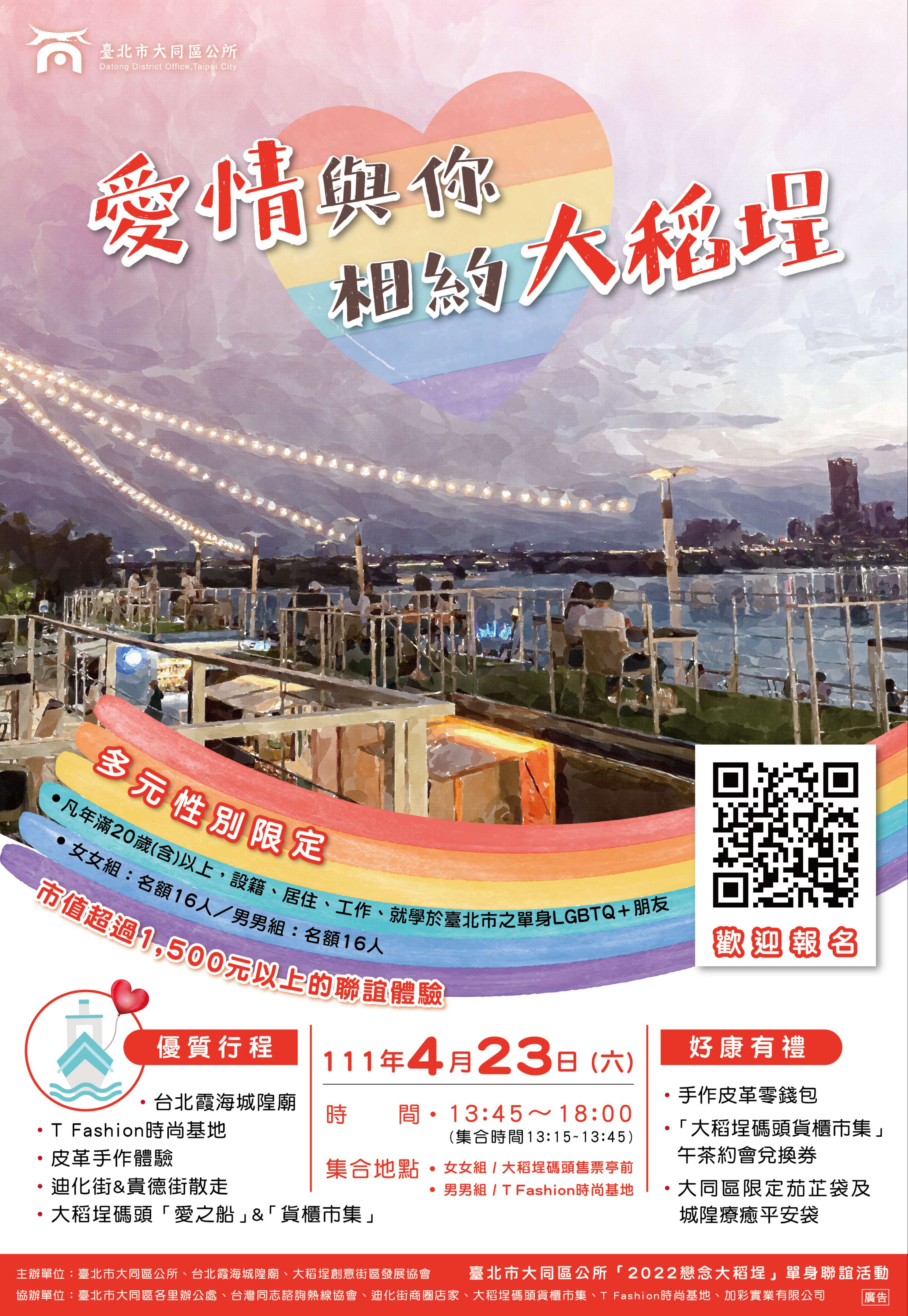 二、請貴單位惠予協助於所屬網站及粉絲團宣傳,文稿內容如下:「臺北市大同區公所『2022戀念大稻埕』多元性別單身聯誼活動,將於111年4月23日(六)下午1時45分至6時,假迪化街商圈街區及大稻埕碼頭舉辦,凡年滿20歲 (含)以上設籍、居住、工作或就學於臺北市之單身同志者皆可參加,總計32個名額,男男組、女女組各16名,免參加費用、免保證金,活動詳情請見報名網址( https://reurl.cc/44Vz2Y)或電洽(02)25975323分機806古小姐。」
