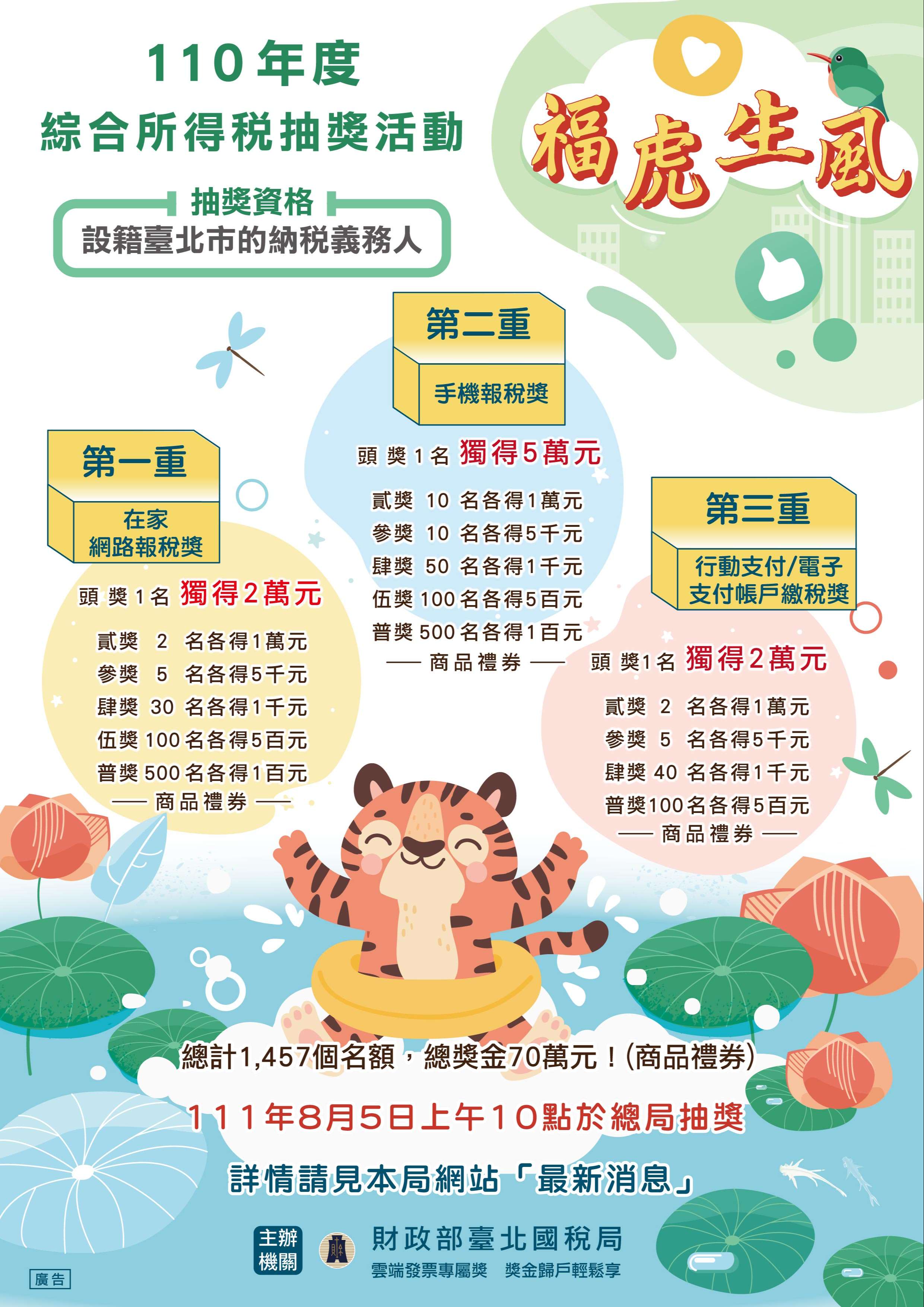 二、本局今年度舉辦「福虎生風」報稅抽獎活動,鼓勵設籍臺北市之納稅義務人運用手機報稅或在家網路報稅,及使用 行動支付或電子支付帳戶繳稅,即可參加抽獎。