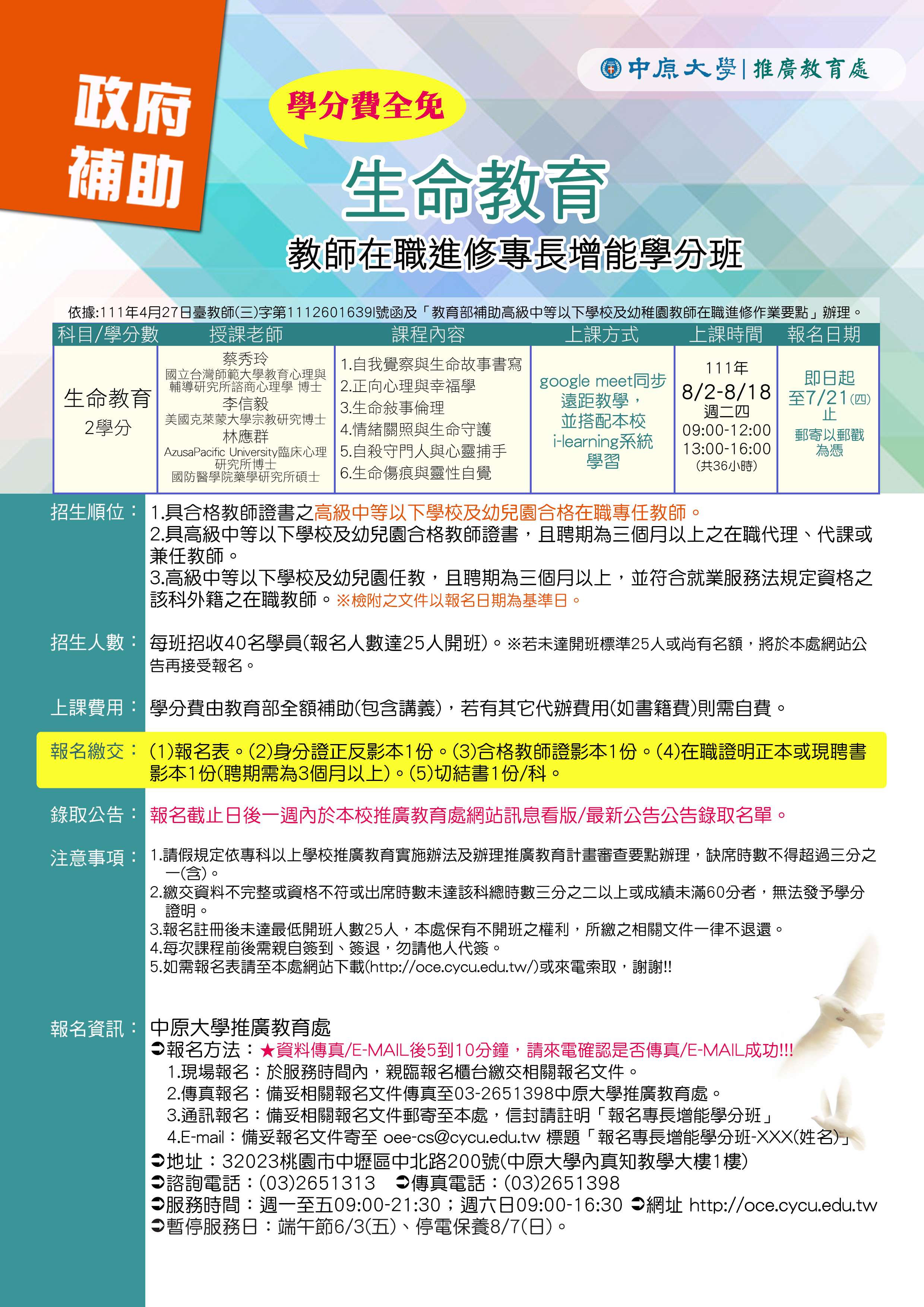 二、「生命教育」課程之報名截止日為111年7月21日,限額40名。