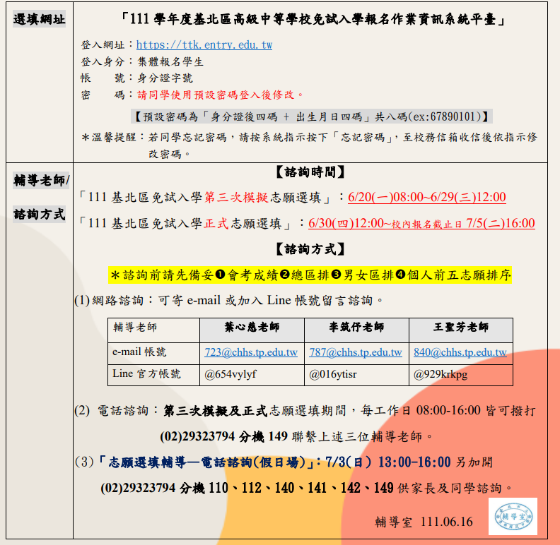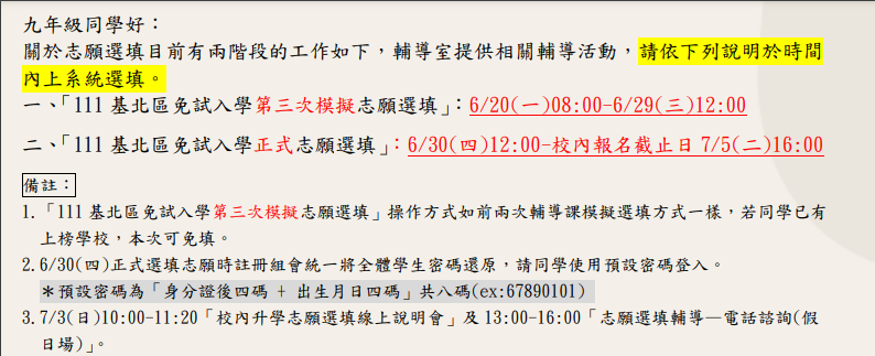 正式選填時間:6/30(四)12:00~校內報名截止日7/5(二)