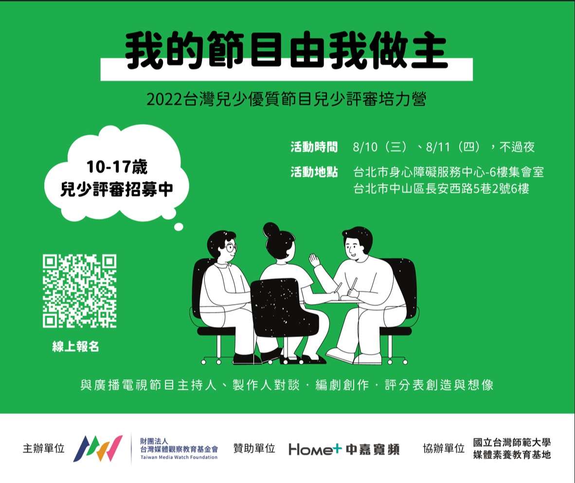 二、旨揭營隊今年的主題為:「我的節目由我做主」,其中 「兒少評審團獎」是最特別的獎項,我們將會邀請節目主 要社群——兒童和青少年來擔任評審,選出心目中最好的 節目!建立以兒少為主體的觀點,來觀賞、收聽與評價 「兒 少節目」,包括從攸關兒少的「價值內涵」到「評分 項目的產生」,都由兒少自主且民主地學習、參與、討 論、合作、思辨及決定。