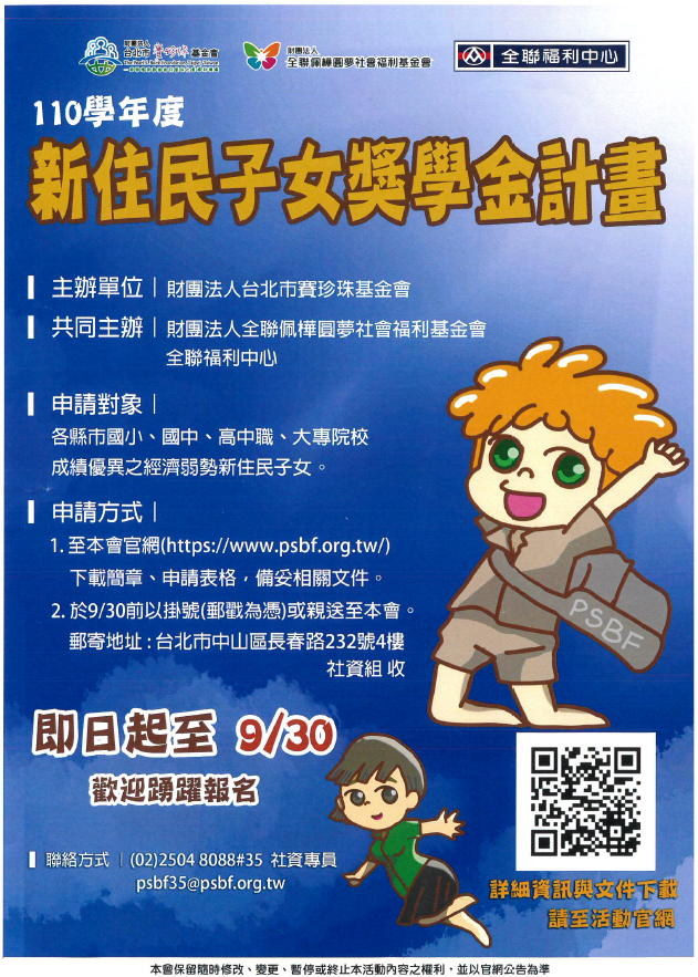 二、旨揭獎學金申請期間自即日起至111年9月30日(星期五)止(郵戳為憑),歡迎符合資格之學生踴躍申請,活動詳情請至賽珍珠基金會網站(網址:https://www.psbf.org.tw/index.php)查詢,或電洽李俐蓉專員(電話:02-25048088轉35)。