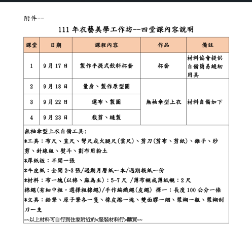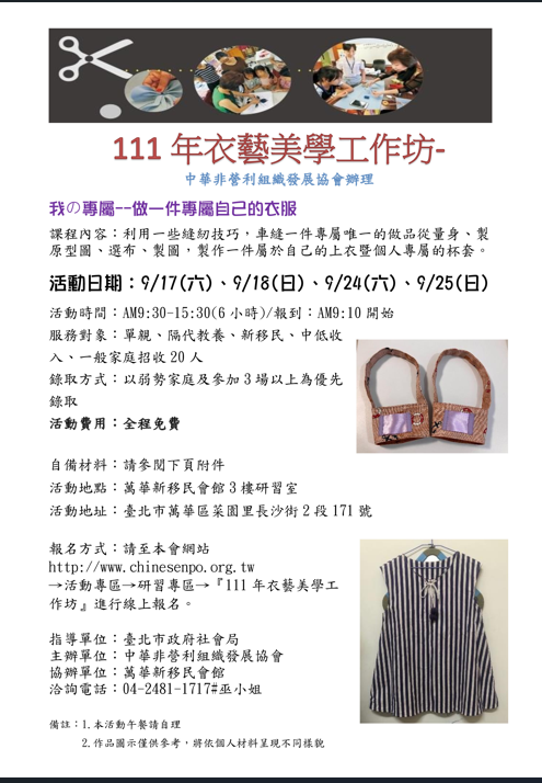 四、報名方式:請至中華非營利組織發展協會網站www.chinesenpo.org.tw →活動專區→研習專區→『111年度衣藝美學工作坊』進行報名,謝謝!