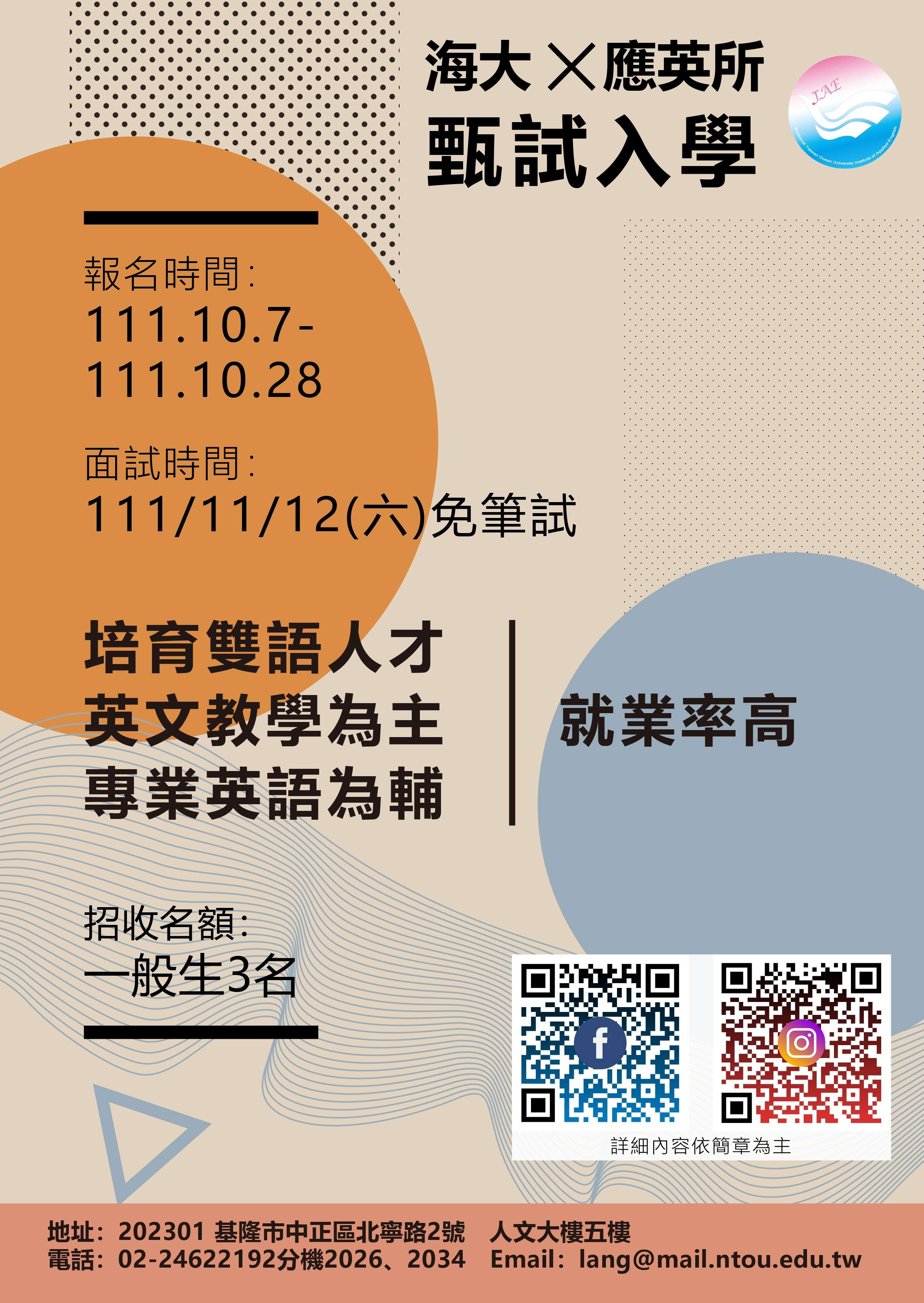 二、本校應用英語研究所112學年度碩士班(甄試入學及考試入