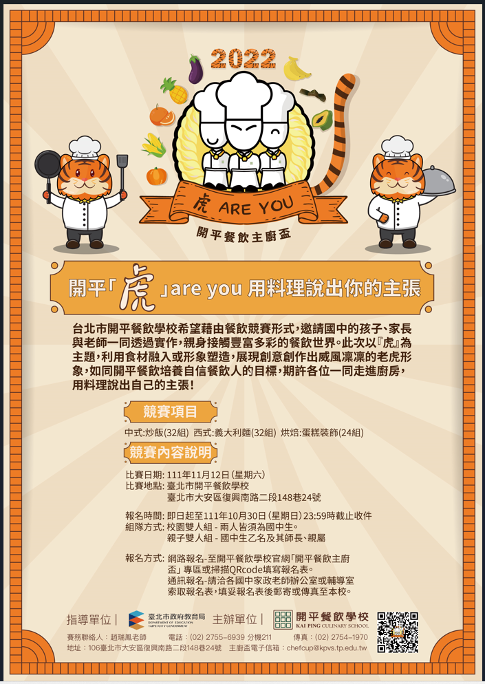 二、本屆比賽類別:分「中式炒飯」、「義大利麵」及「蛋糕裝飾」三項。藉由「開平『虎』are you」為主題,老虎具威風凜凜的大眾印象,如同開平餐飲培養自信餐飲人的目標,邀請喜愛餐飲的國中生,能內觀自身興趣發展,並依主題盡情發揮創意,以料理展現自我、創造未來無限可能。