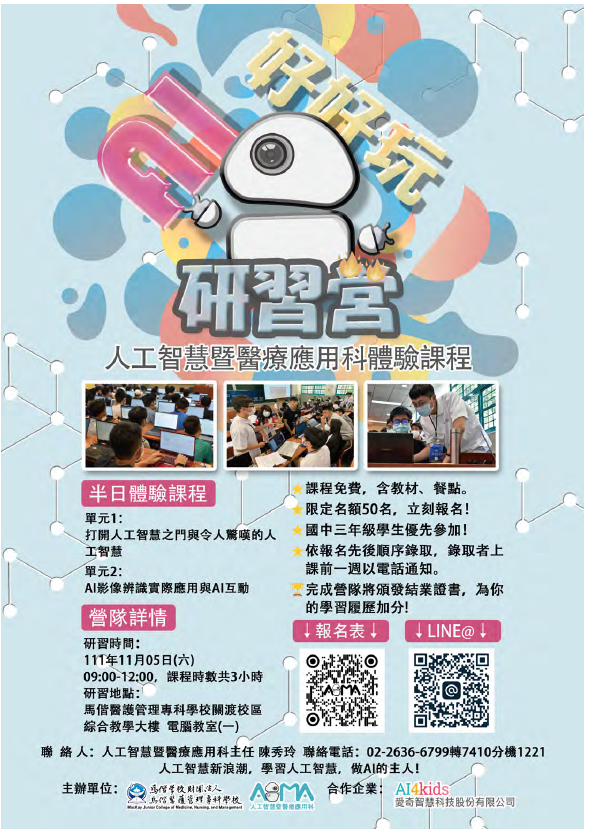 六、報名聯絡電話:2636-6799分機7410-1221,人工智慧暨醫療應用科陳秀玲主任。