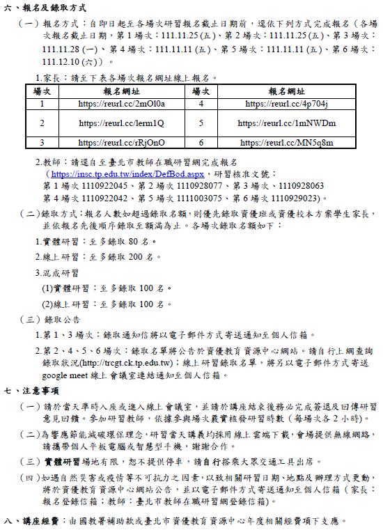 報名網址 1 https://reurl.cc/2mOl0a 2 https://reurl.cc/lerm1Q 3 https://reurl.cc/rRjOnO 4 https://reurl.cc/4p704j 5 https://reurl.cc/1mNWDm 6 https://reurl.cc/MN5q8m