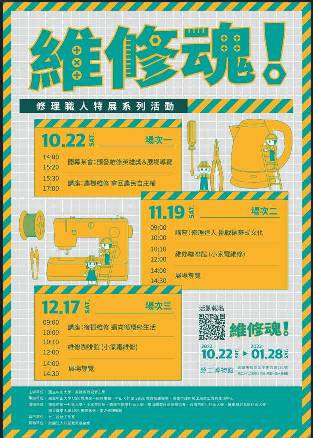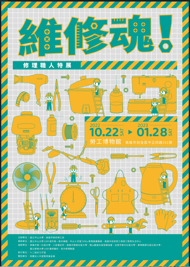 一、本展覽於民國111年10月22日至112年1月28日假高雄市勞工博物館(高雄市前金區中正四路261號)展出,以深入淺出的方式了解維修是循環經濟的一環,與其在當代環境、經濟、社會的多重價值。