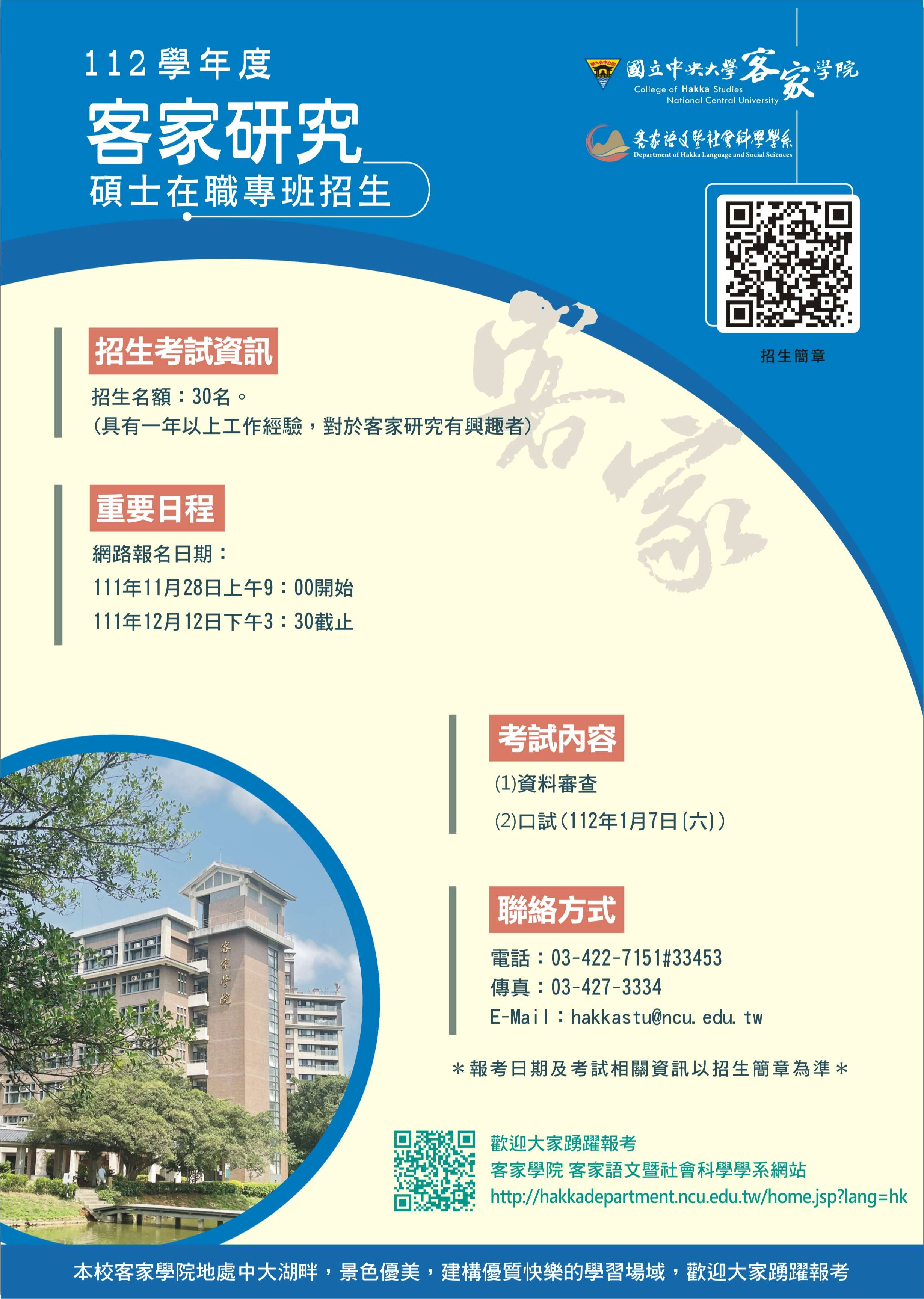 一、本校客家語文暨社會科學學系「客家研究碩士在職專班」