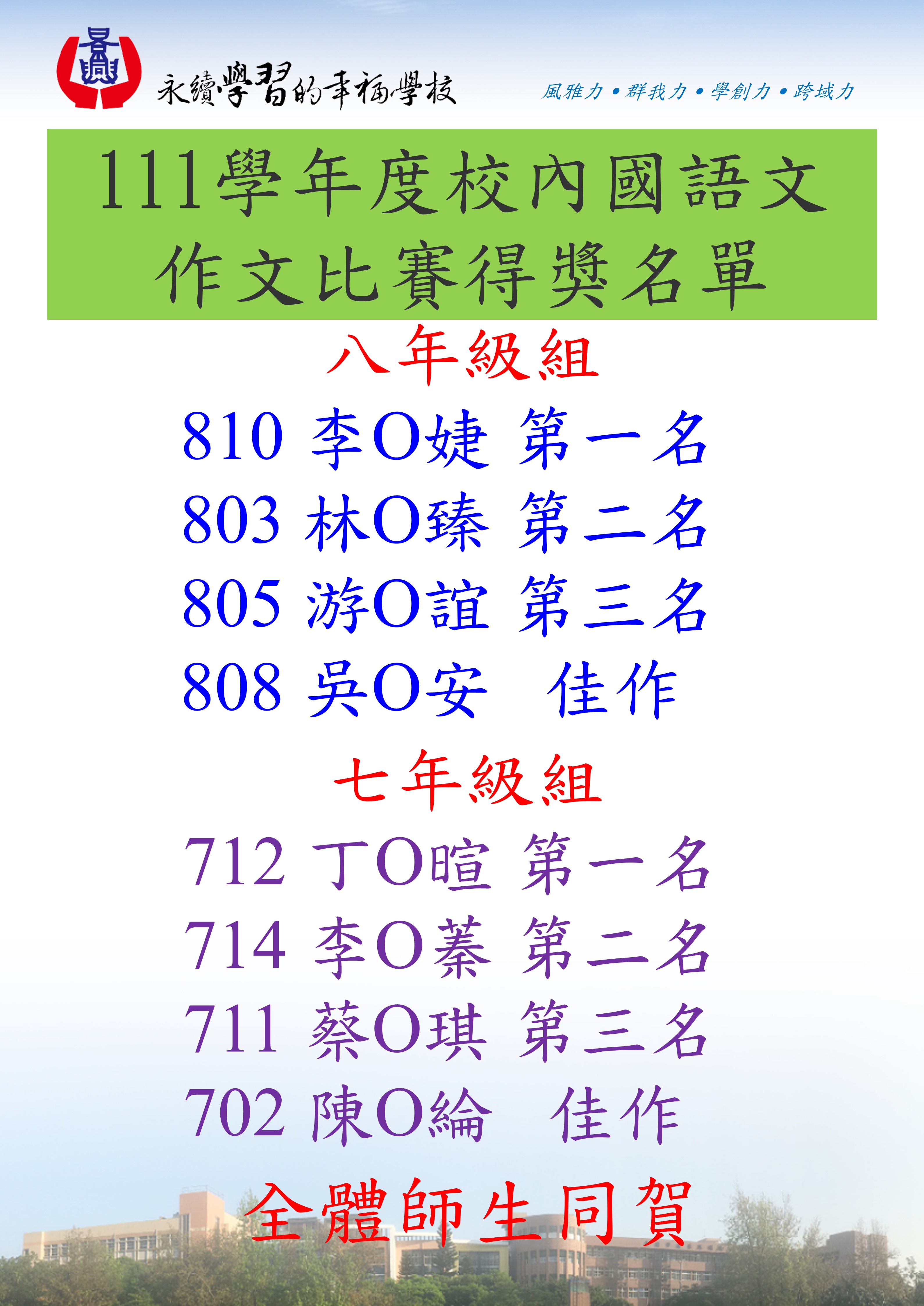 由八年級第一名代表學校參加112年度臺北市國語文競賽