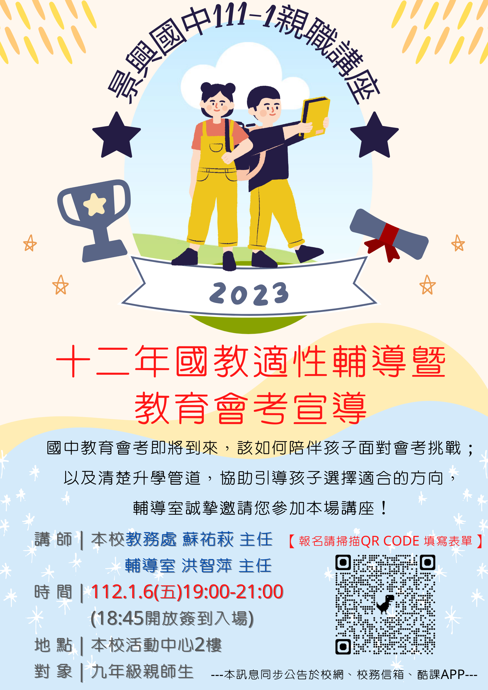 九年級家長、同學好: 欲參加者可點選報名表連結https://forms.gle/5G1uqLWbMD7KZXe99 或掃描下方QR code填寫。