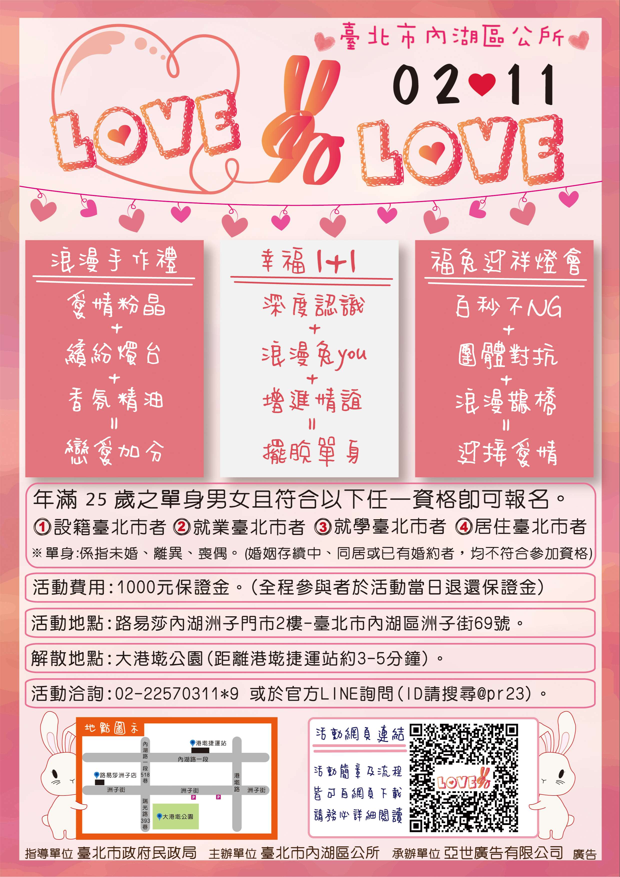 臺北市內湖區公所將於112 年2月11日(六)下午12時30分至19時舉辦單身聯誼活動, 活動名額為男、女性各20人,共40人,歡迎年齡年滿25歲以上,設籍於本市或於本市就業、就學或居住之未婚市民踴躍報名參加,詳情請見內湖區公所官網最新消息或電洽 (02)27925828轉605內湖區公所洪小姐。