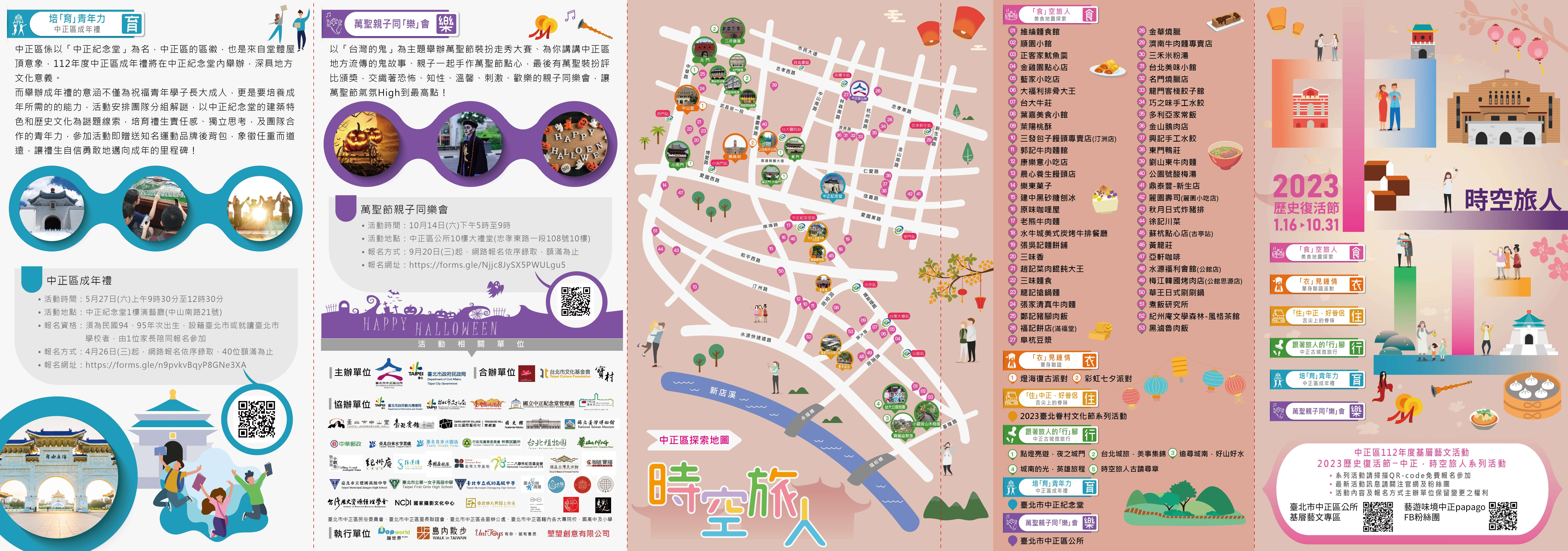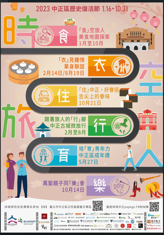 「2023歷史復活節~中正.時空旅人」系列活動,於112年1月16日至10月31日辦理,活動包含1月至10月「食」空旅人-美食地圖探索、2月14日及8月19日「衣」見鍾情-單身聯誼、10月21日「住」中正,好嘉在-嘉禾新村的故事、2月至8月跟著旅人的「行」腳-中正古城微旅行、5月27日培「育」青年力-中正區成年禮、10月14日萬聖親子同「樂」會,6大項豐富精采的系列活動,邀您一同嬉遊中正,體驗趣味又知性的古蹟歷史!