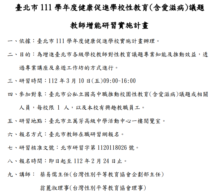 性教育(含愛滋病)議題教師增能研習,請踴躍參加