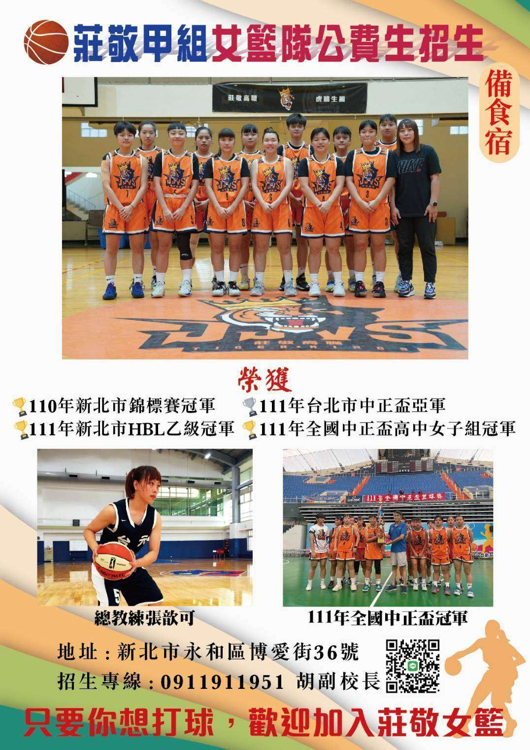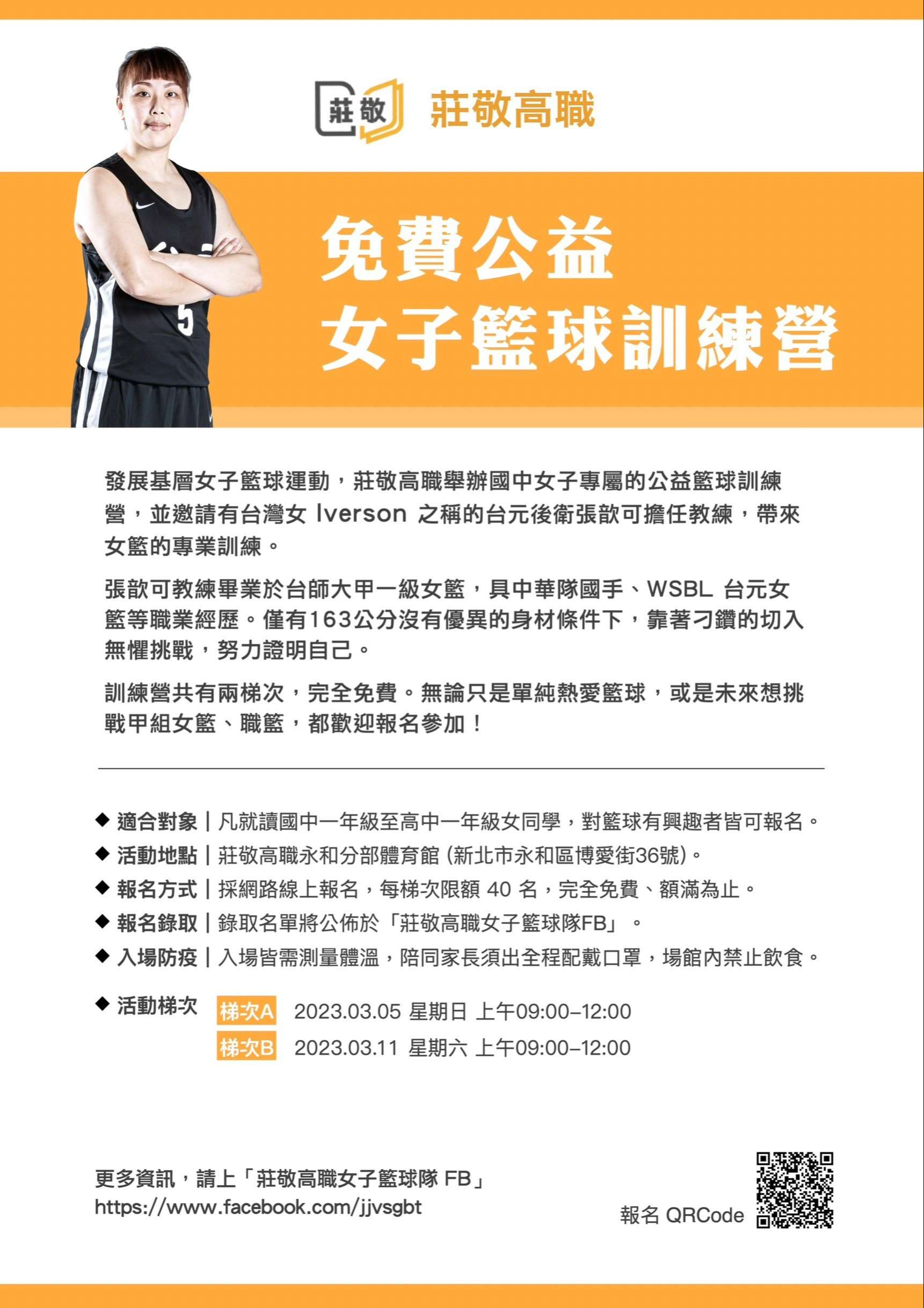 一、為協助發展基層女子籃球運動,莊敬高職舉辦國中女子專 屬的公益籃球訓練營,並邀請有台灣女Iverson 之稱的台 元後衛張歆可擔任教練,帶來女籃的專業訓練。無論只是 單純熱愛籃球,或是未來想挑戰甲組女籃、職籃,都歡迎 報名參加。