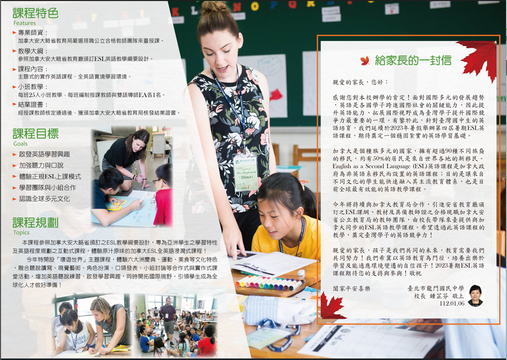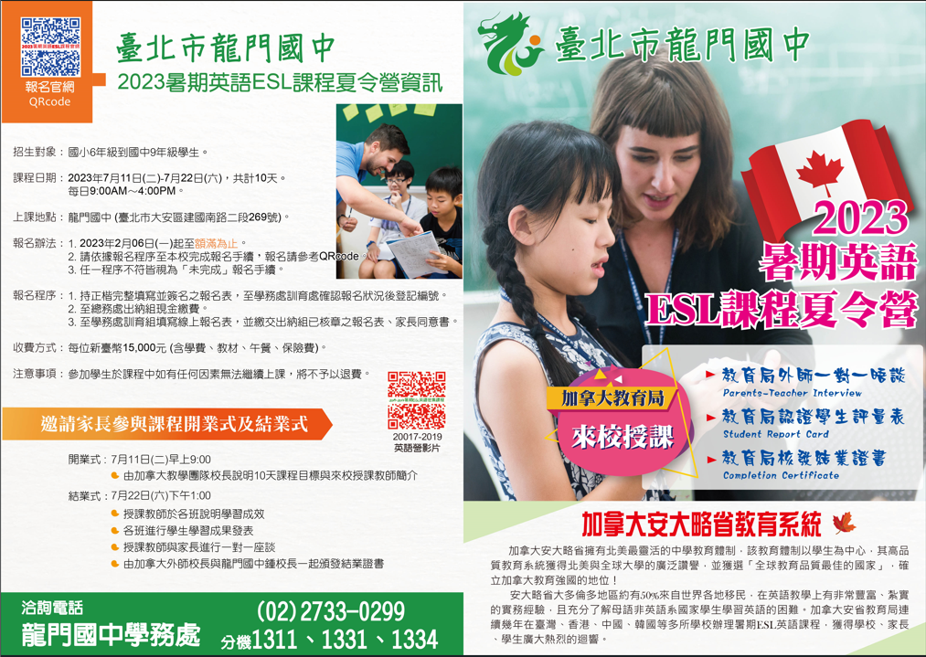 一、有關龍門國中辦理2023年度暑期英語ESL課程夏令營實施計畫,尚有部分名額,歡迎報名。