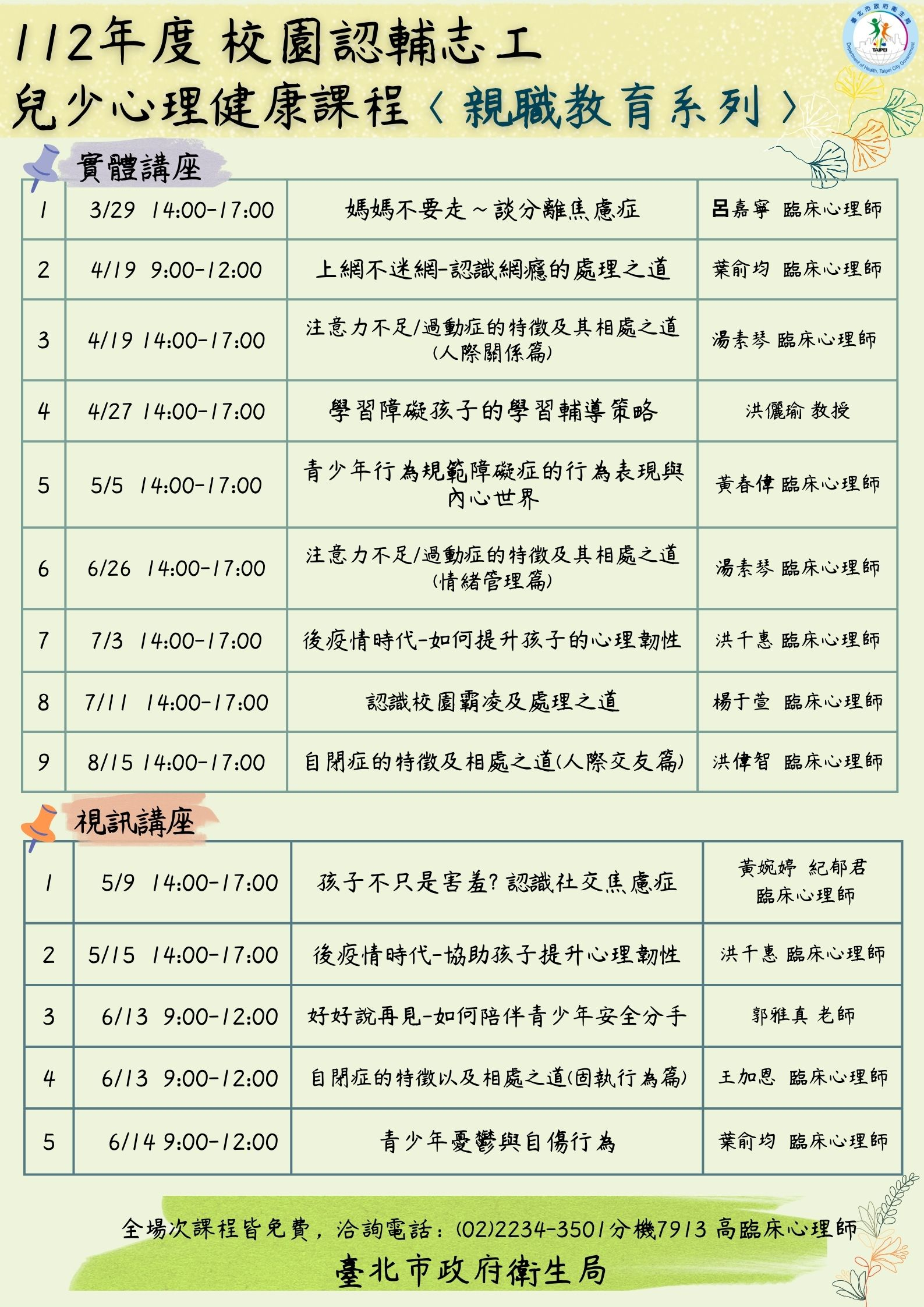(四)報名網址:https://mental-health.gov.taipei/(臺北市社區心理衛生中心官網-報名專區-講座/活動)